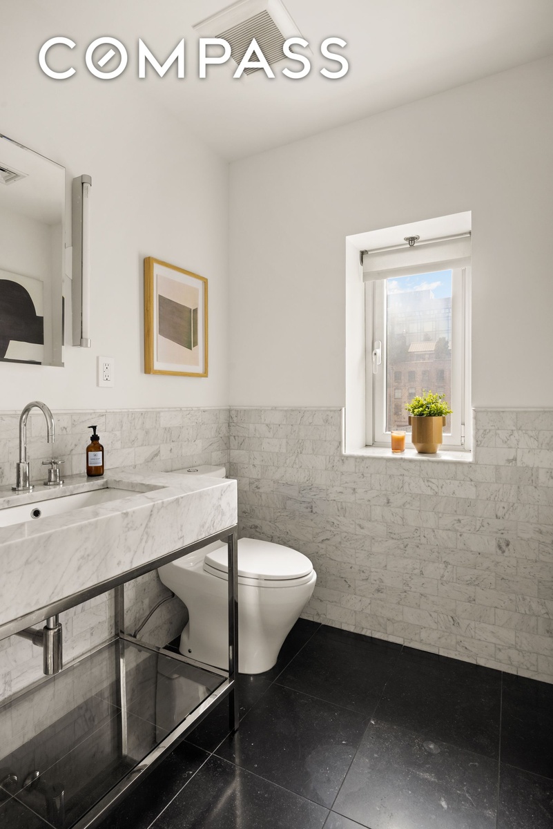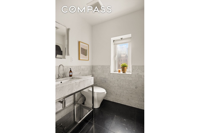 • The private residence wing, set behind iron and glass casement doors, comprises two secondary bedrooms (each with ensuite baths), a laundry room, and an enviable primary suite complete with an oversized walk-in dressing closet, secondary storage/ linen closet and a five-fixture ensuite bath finished in Carerra marble and Belgian bluestone.