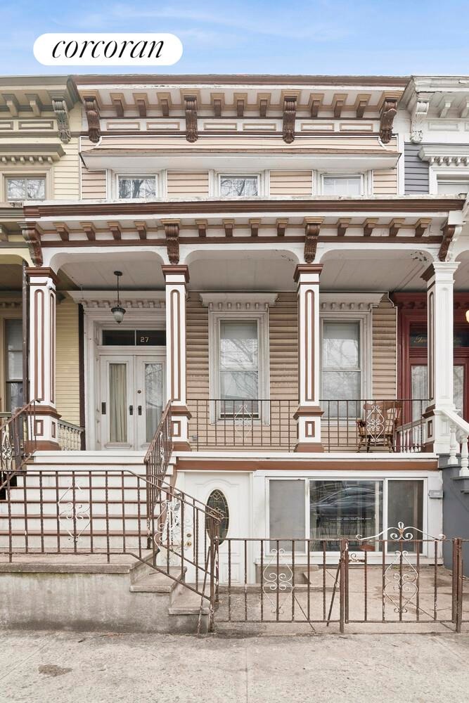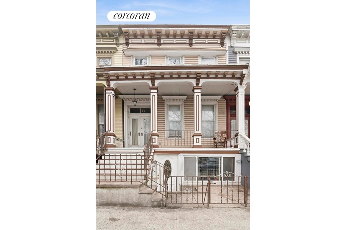 Defined by classic 19th century architectural details, this home features a richly ornamented cornice, decorative brackets, and an inviting raised stoop - a timeless facade that reflects the craftsmanship of Brooklyn's gilded rowhouse era. The symmetrical exterior, tall window proportions, and articulated porch columns create a strong architectural presence while blending seamlessly into the surrounding streetscape of well-preserved townhomes.