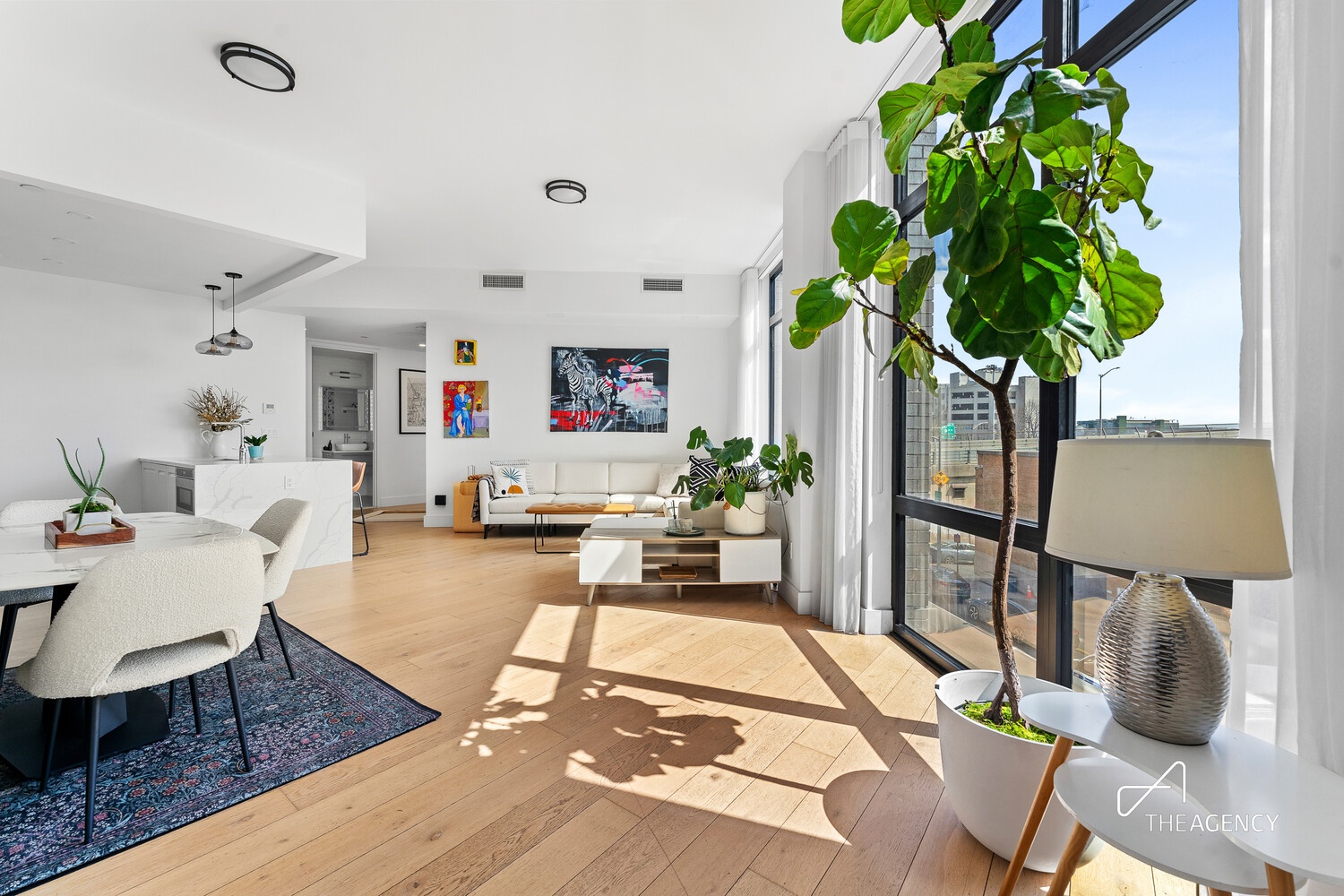 This south-facing home is filled with natural light throughout the day and features oversized windows with open views and endless blue sky, 10-foot ceilings, large gallery walls, and excellent closet space with custom built-ins. The expansive great room offers distinct living and dining areas, complemented by white oak floors and custom drapery.