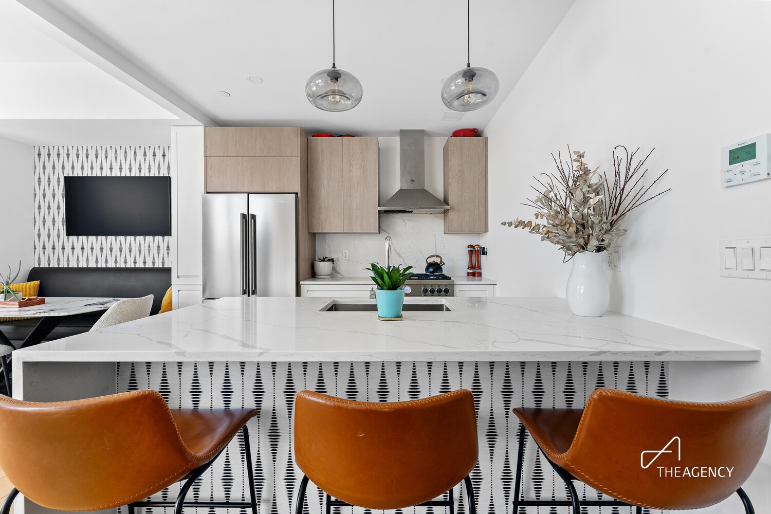 The sleek, modern kitchen is outfitted with white quartz countertops, a waterfall island, Scavolini cabinetry with custom built-ins, a Bertazzoni range and microwave drawer, and a Blomberg fridge-freezer and Miele dishwasher.