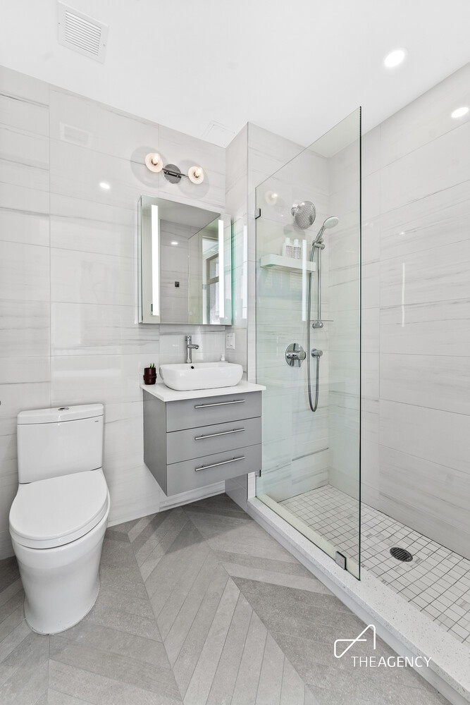 Both bathrooms are generously proportioned and finished with Toto toilets, Grohe showerheads, illuminated mirrors, and radiant heated floors. A washer-drier and laundry closet is discretely located away from the primary living area.