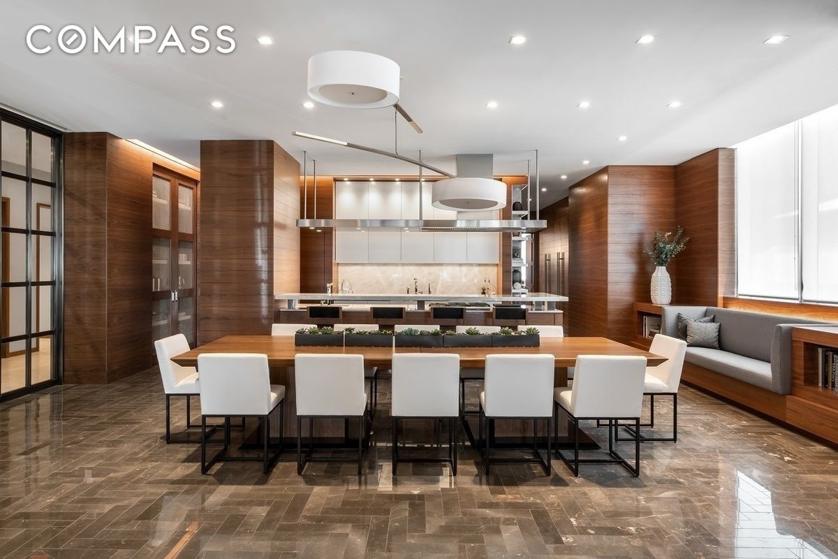The culinary experience is equally elevated, featuring a custom Scavolini kitchen clad in walnut cabinetry and Vagli Fine Vein marble waterfall countertops. While the developer provided an elite foundation, these owners further enhanced the space with a professional-grade Thermidor six-burner chef’s stove and a custom-built pantry finished with matching marble surfaces. A suite of Sub-Zero refrigeration, a Gaggenau wine fridge, and Dornbracht fixtures complete this chef’s atelier.