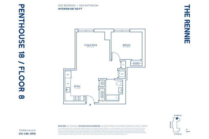 thermostat with remote access, Fisher & Paykel washer and dryer, USB charging ports, and pre-wiring for cable, telephone, and data. Central heating/ cooling and high-performance, energy-efficient windows ensure year-round comfort. The Rennie offers a full suite of amenities, including a 24x7 attended lobby, fitness center, rooftop terrace, entertaining terrace, party/work room, children's playroom, and pet spa. Attended parking with building access (additional fee). Ideally located near the 2, 3, A, C, and B subway lines, and moments from Harlem YMCA, Harlem Hospital, Ponty Bistro, The Shrine, and a vibrant mix of cafeĢs, galleries, and nightlife.