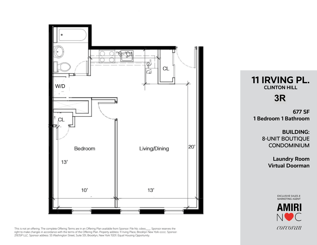 This is not an offering. The complete Offering Terms are in an Offering Plan available from Sponsor. File No. CD05-0566. Sponsor reserves the right to make changes in accordance with the terms of the Offering Plan. Property address: 11 Irving Place, Brooklyn New York 11238. Sponsor: IRVING 11, LLC. Sponsor address: 14 Bond Street, Suite 126 Great Neck, NY 11021. Equal Housing Opportunity.