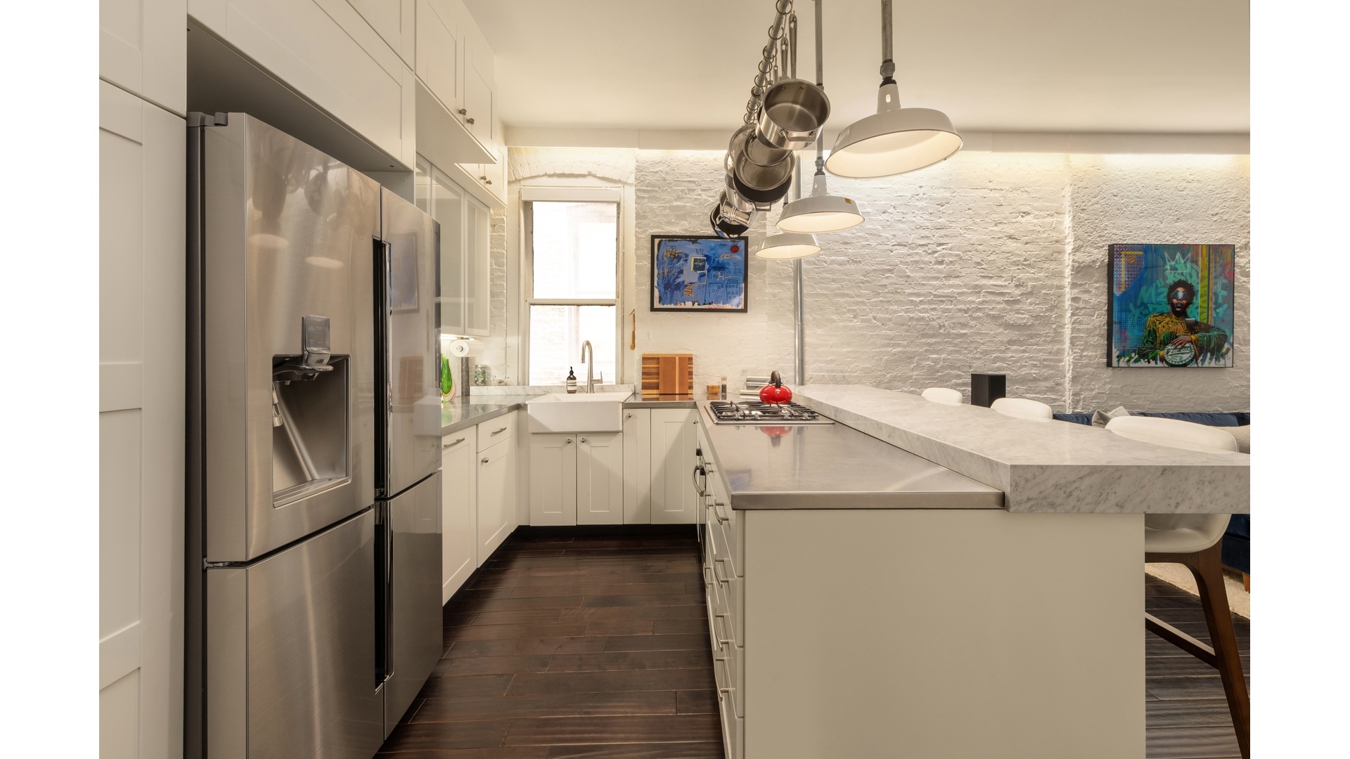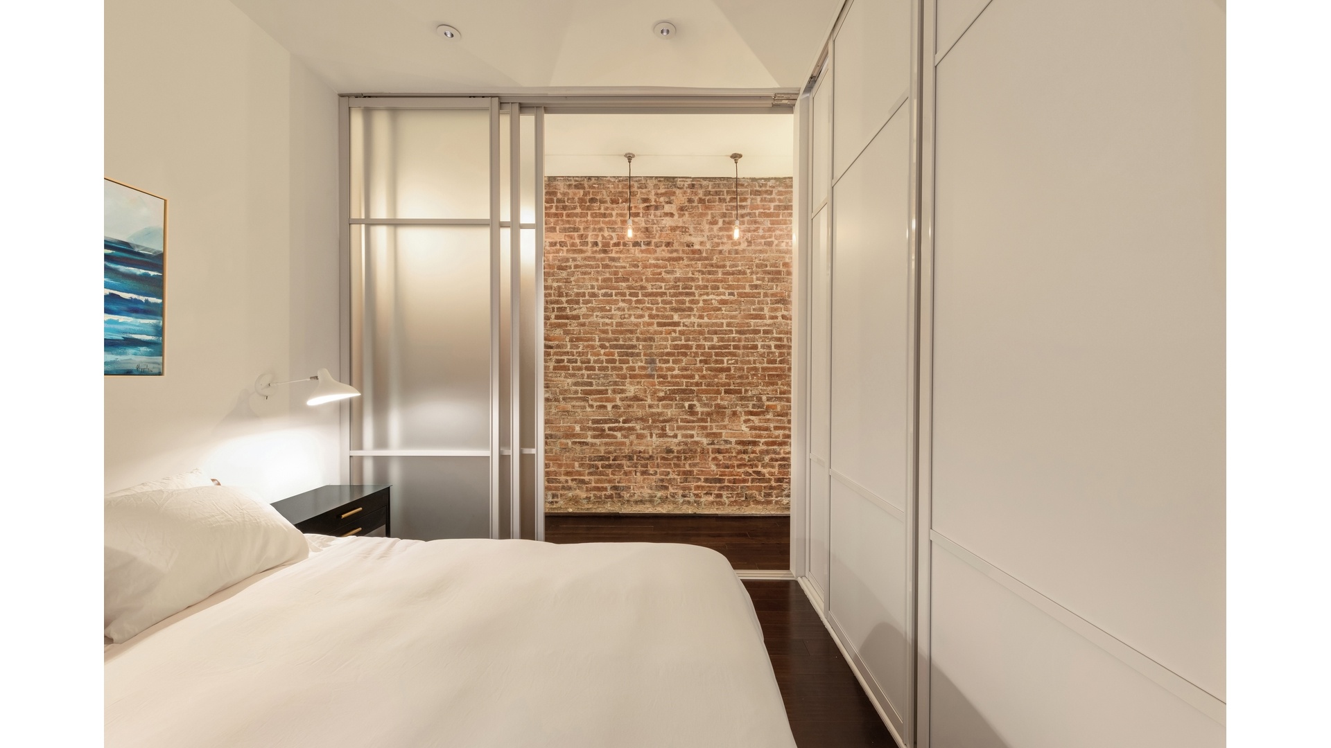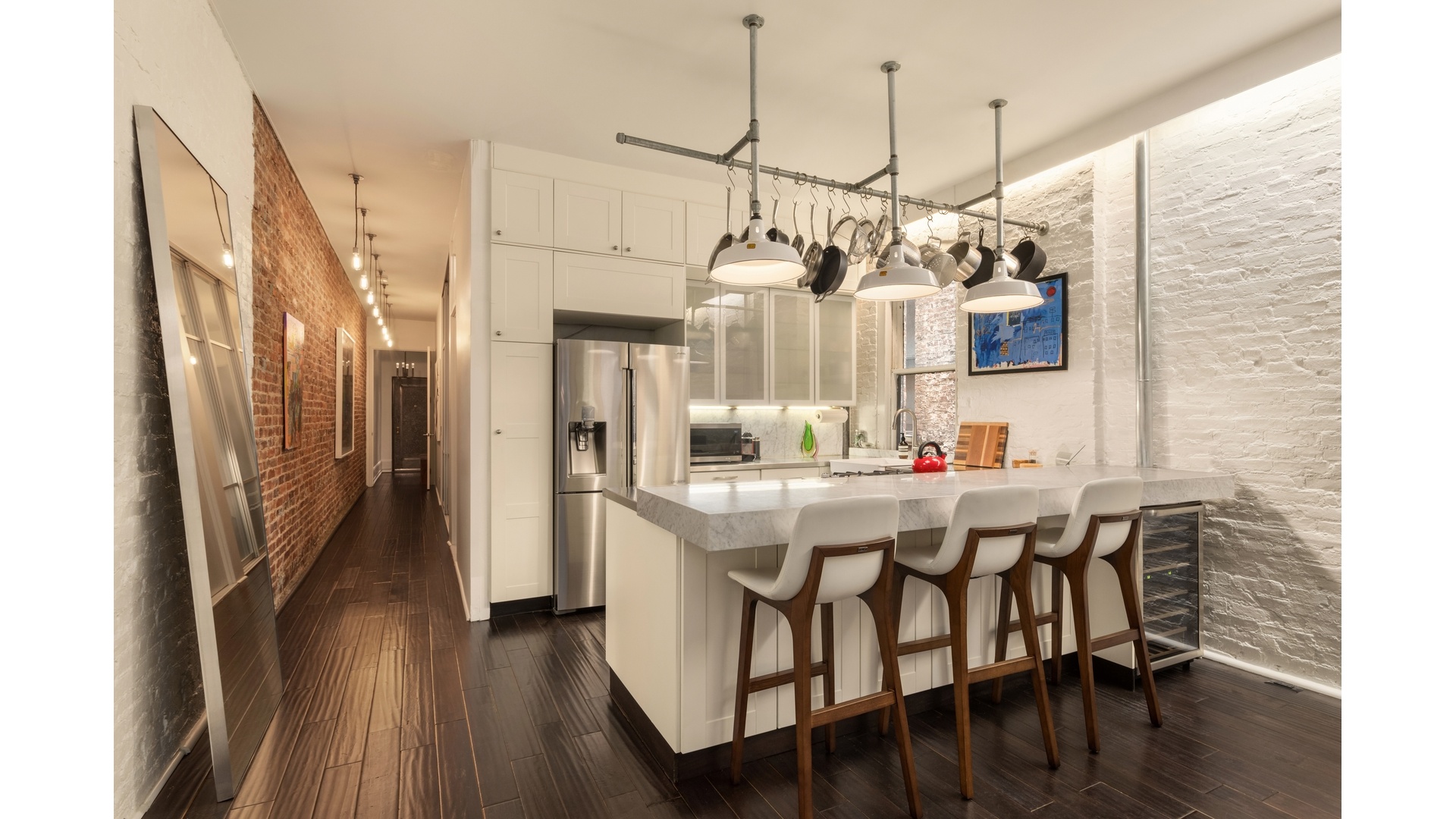 From the moment you enter, the home feels intentional. A rare, private mudroom provides the perfect drop zone for coats, shoes, and everyday essentials, while creating an added layer of separation that enhances privacy and tranquility in this pin-drop quiet apartment. Beyond, a gallery-style hallway highlighted by an exposed brick wall leads you into an expansive living and entertaining space.