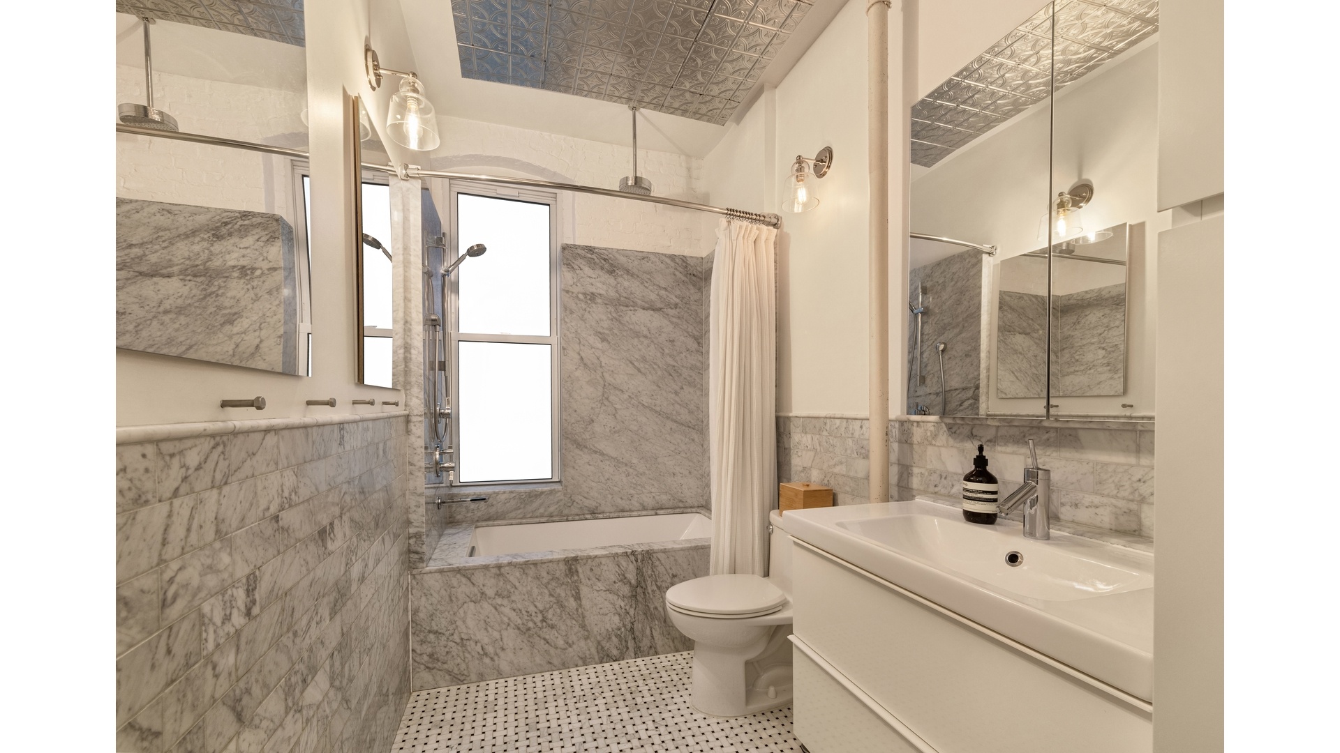 Hardwood floors throughout and soaring 9'9" ceilings complete the home's refined, move-in-ready appeal-an ideal Park Slope residence that balances comfort, function, and design.
