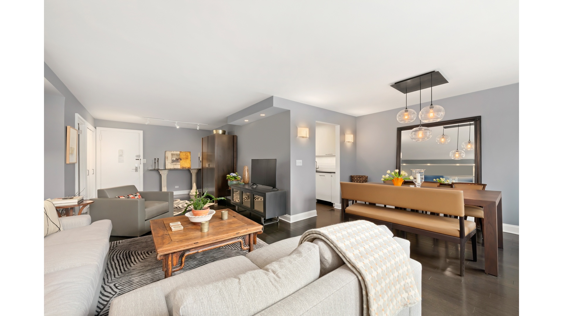 The layout is as thoughtful as it is functional, anchored by a true, separate dining area that creates a natural distinction between living and entertaining. The kitchen and bath have been newly renovated with a refined sensibility, featuring custom cabinetry, sleek stone counters, and stainless steel appliances that balance beauty with performance. Storage is abundant and intelligently designed, while the bedroom offers exceptional scale and comfort, easily accommodating a variety of configurations without compromise.