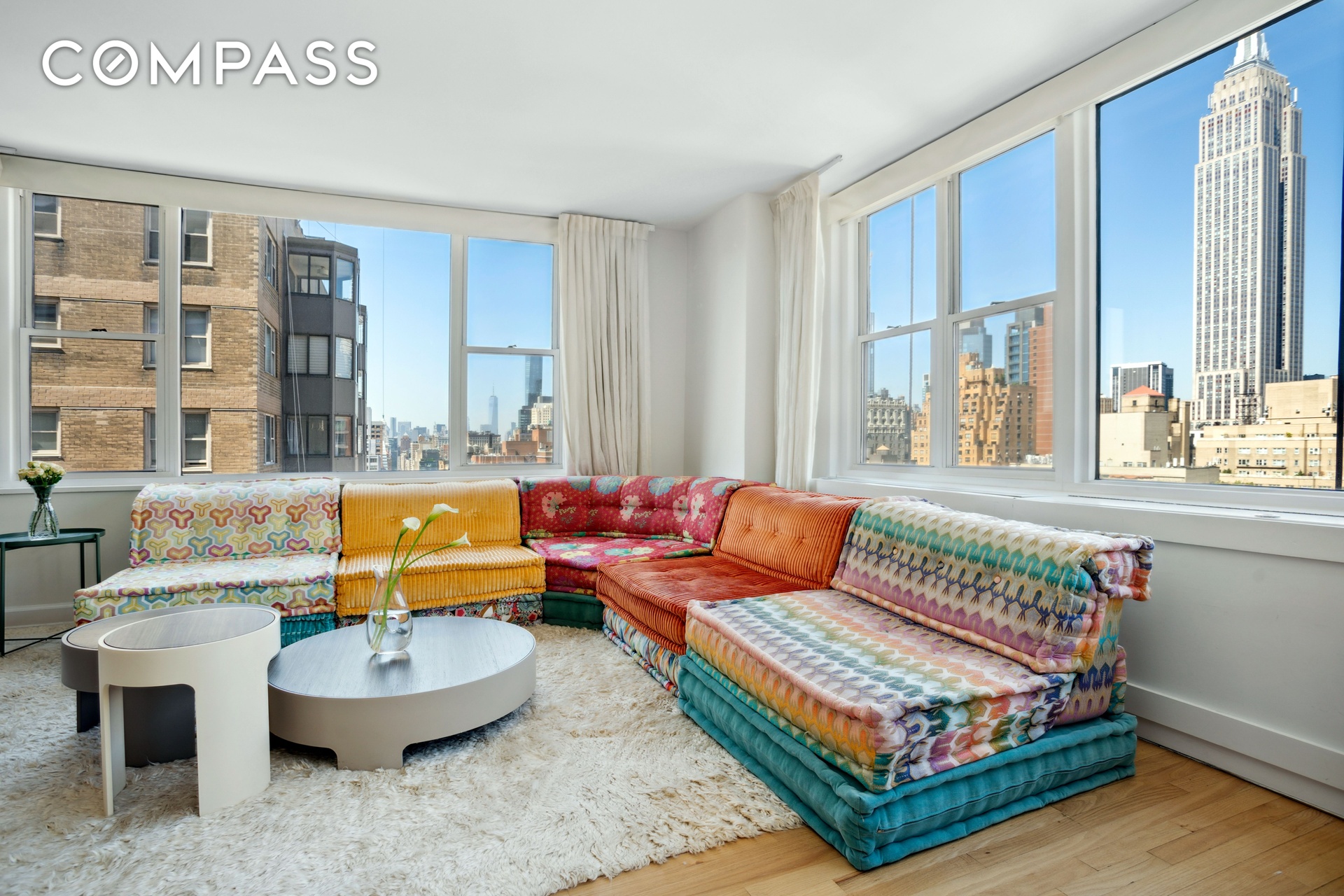 The sun-flooded great room opens to two walls of oversized windows framing one of New York City’s most iconic skylines — the Empire State Building and One World Trade Center anchoring the view.