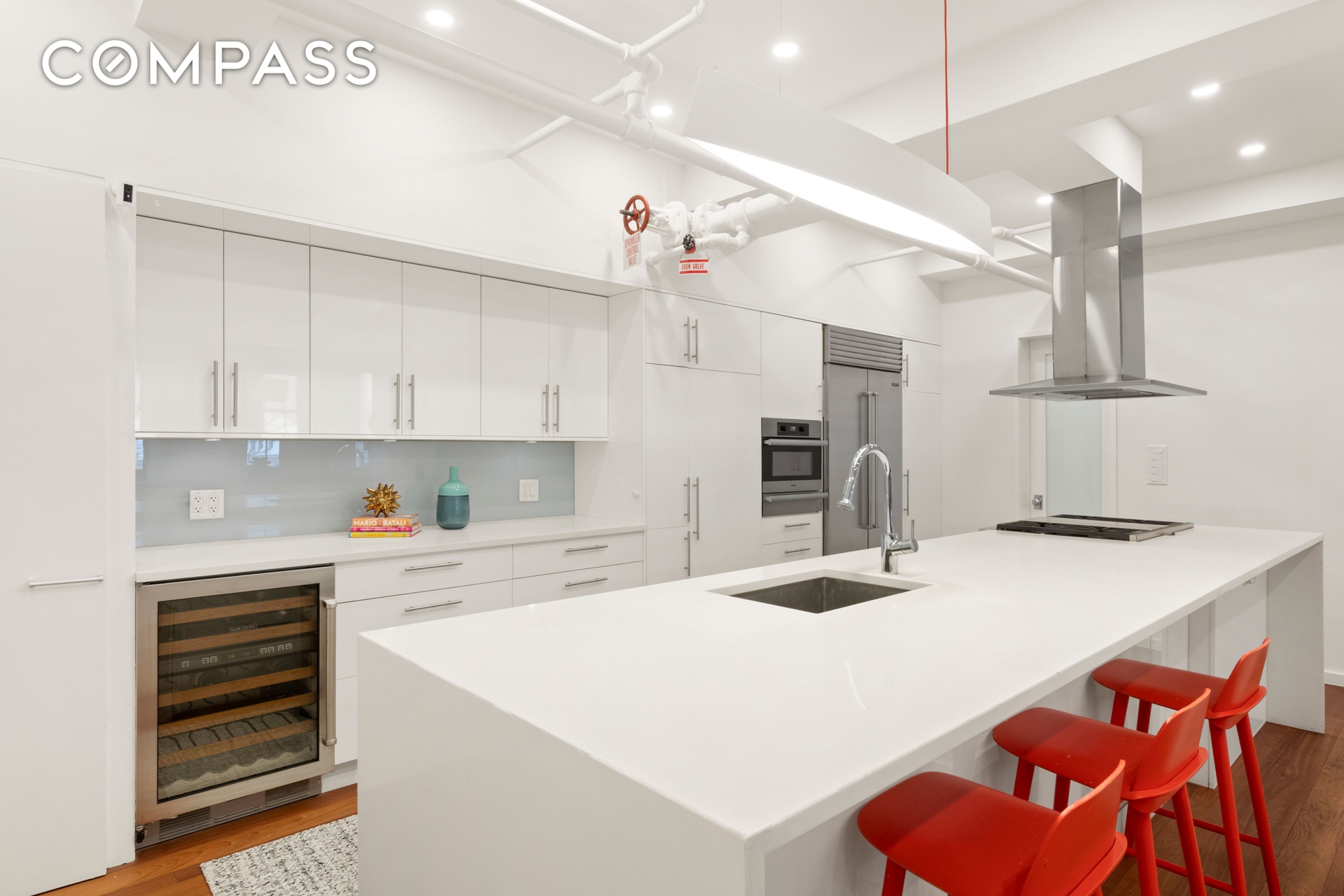 At the heart of the home is a thoughtfully designed open kitchen that feels as welcoming as it is functional. Outfitted with top-of-the-line appliances—including a Miele oven, Sub-Zero refrigerator, Viking range, dishwasher, and wine fridge—the space is anchored by a generous caesarstone island perfect for morning coffee, casual meals, or gathering with friends and family. Custom cabinetry and a pantry offer abundant storage, keeping everything beautifully organized.