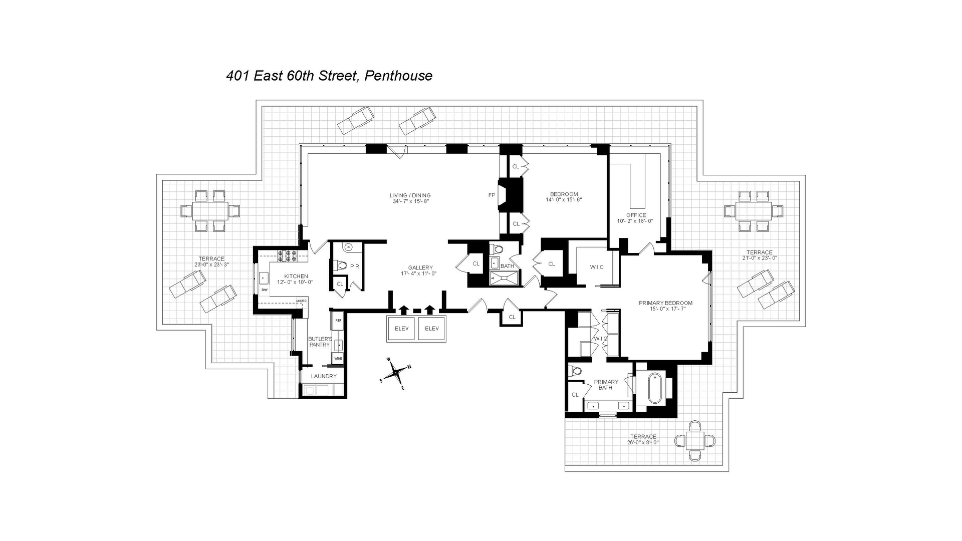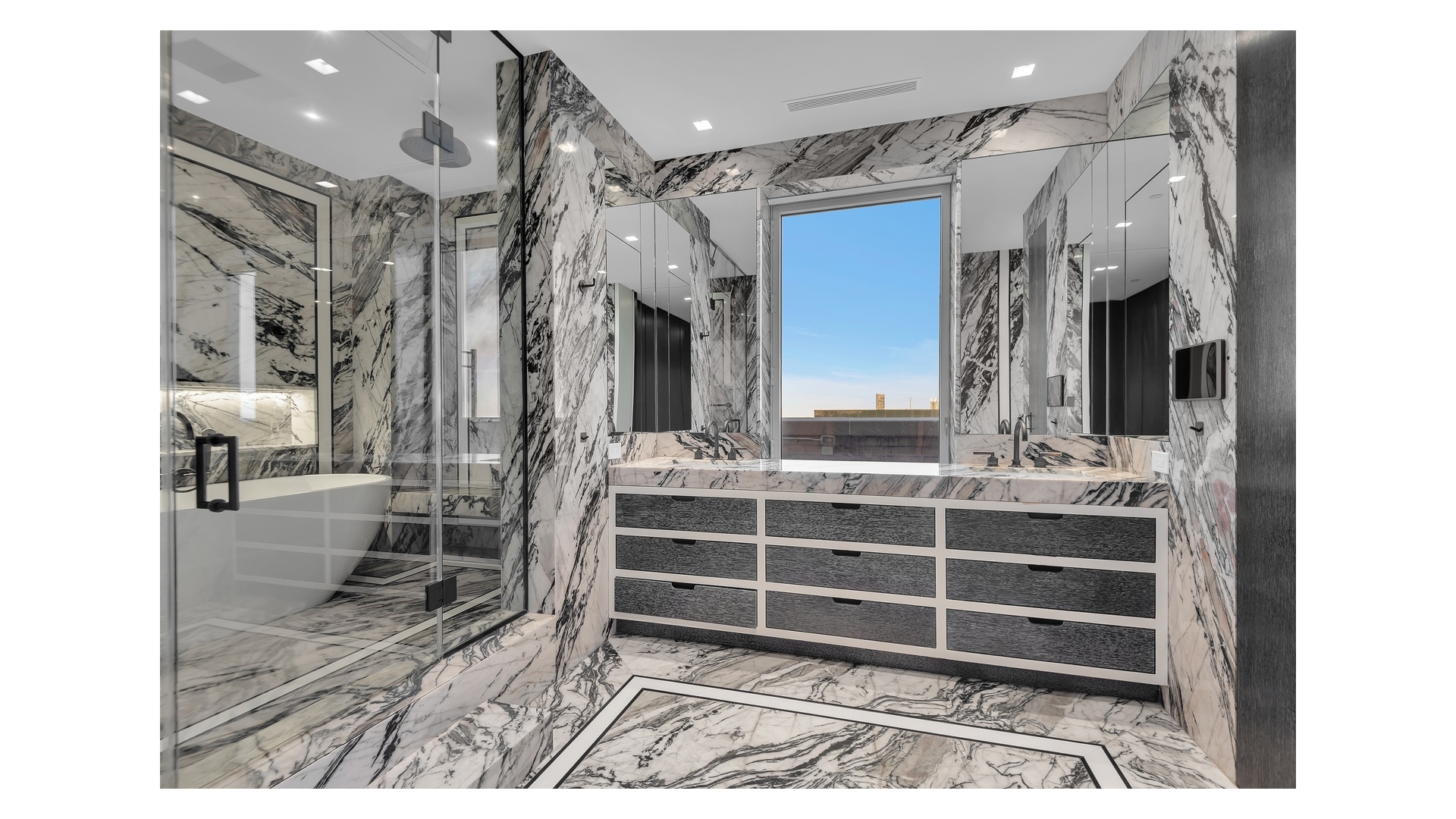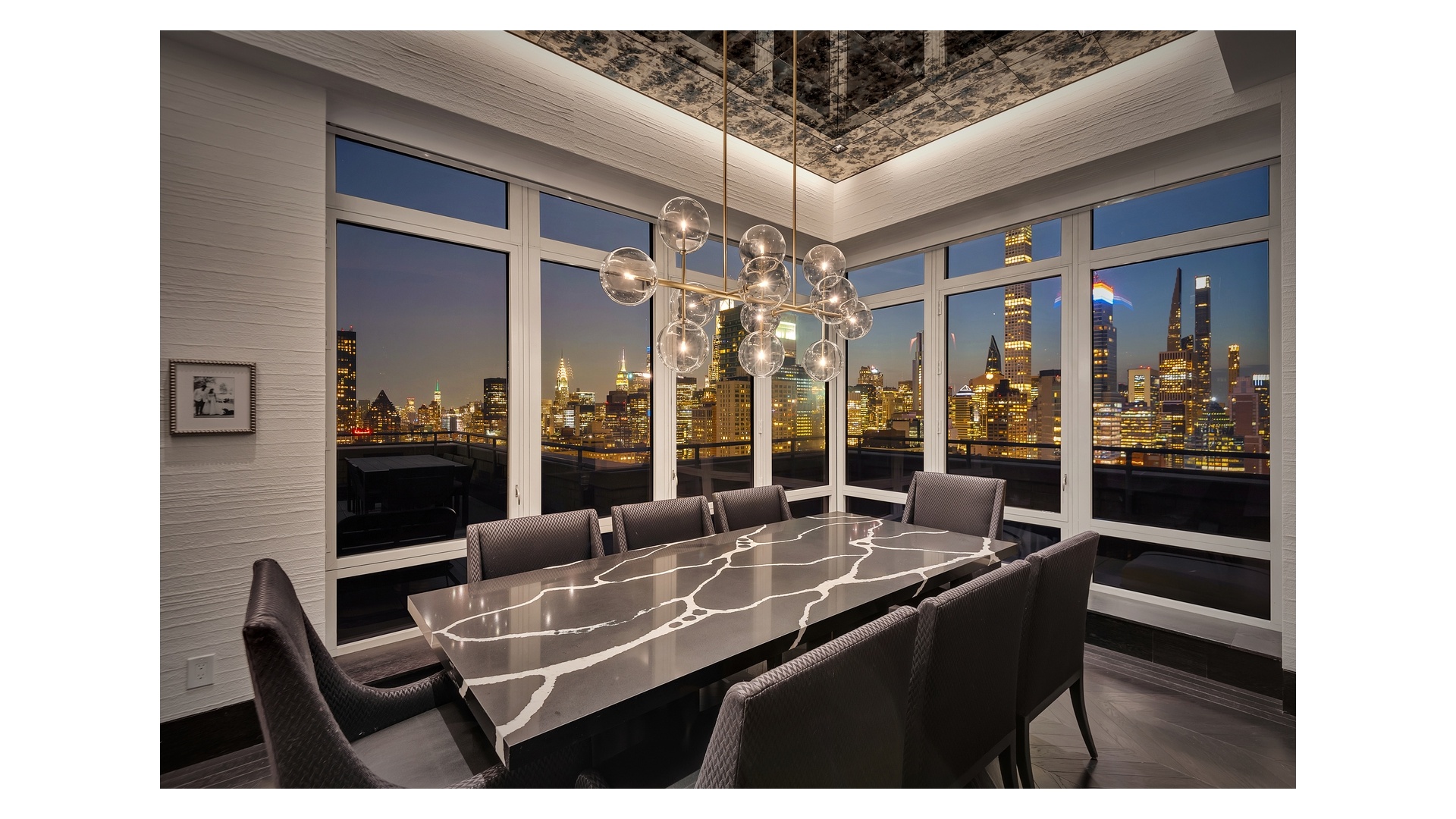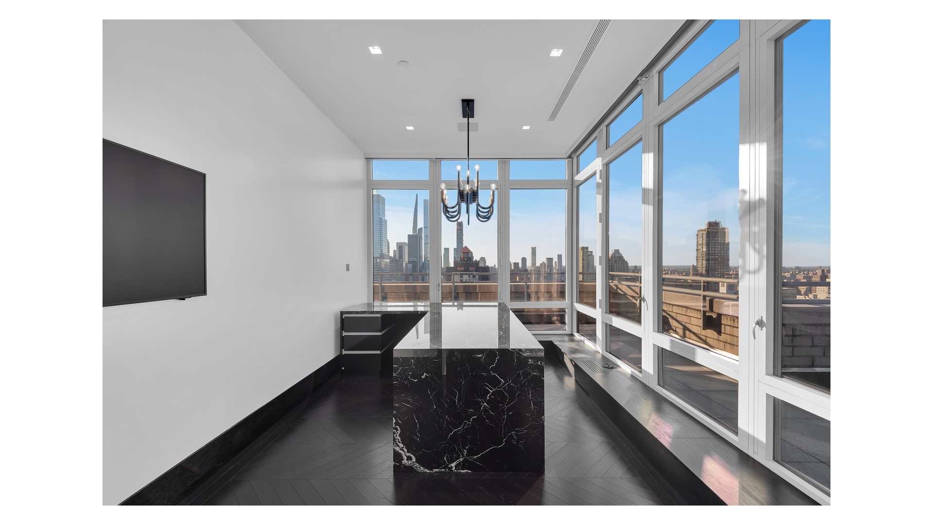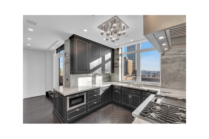 The crown jewel of the home is the expansive wraparound terrace-offering multiple seating and dining areas and capturing sweeping 360-degree views of the Manhattan skyline, East River, and beyond.