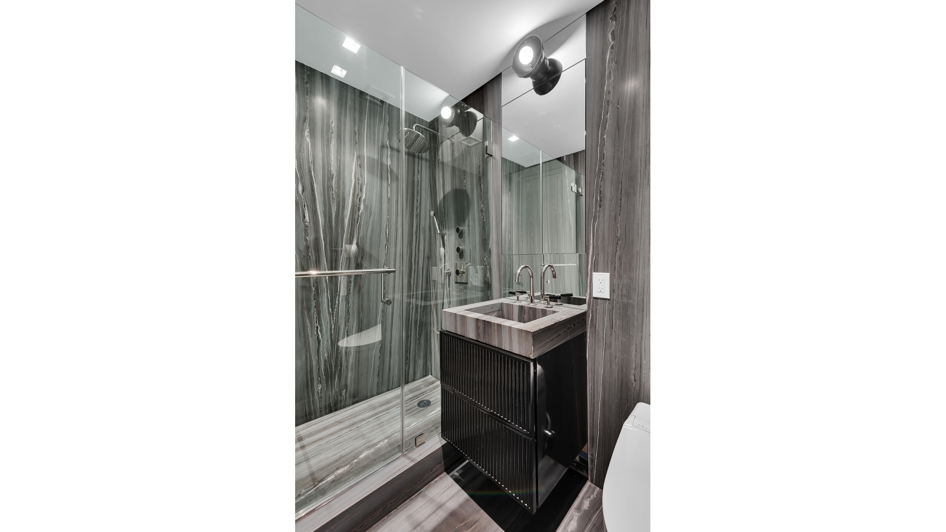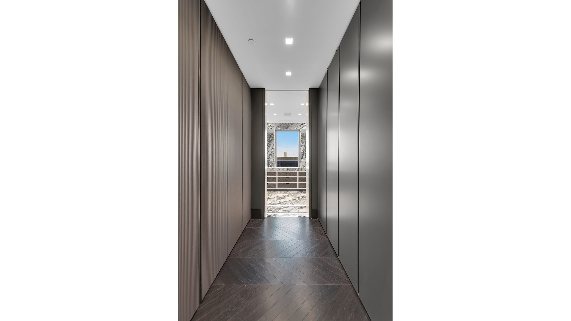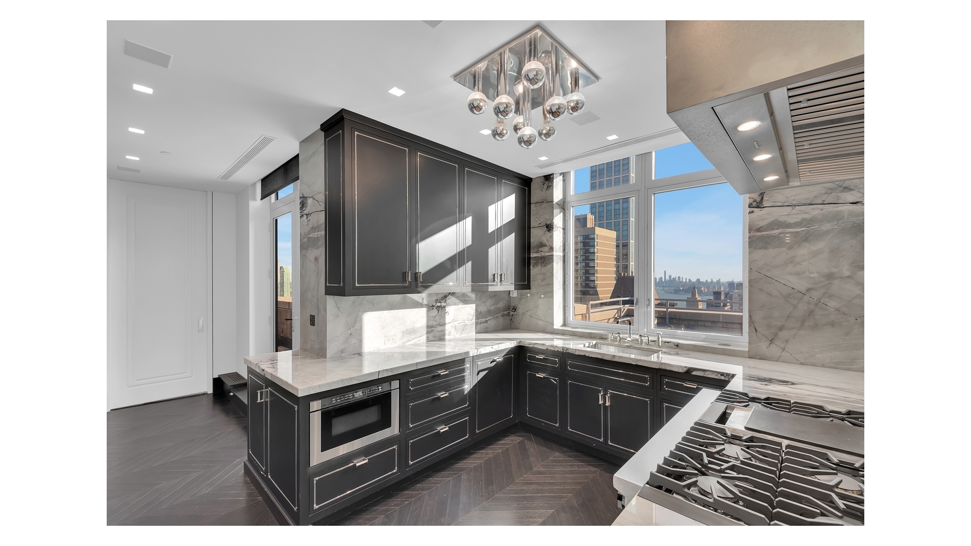 The windowed chef's kitchen is outfitted with top-tier appliances and sleek stone surfaces, seamlessly connecting to the main entertaining areas. The primary suite is a private retreat, complete with a luxurious marble bath and direct access to the terrace.