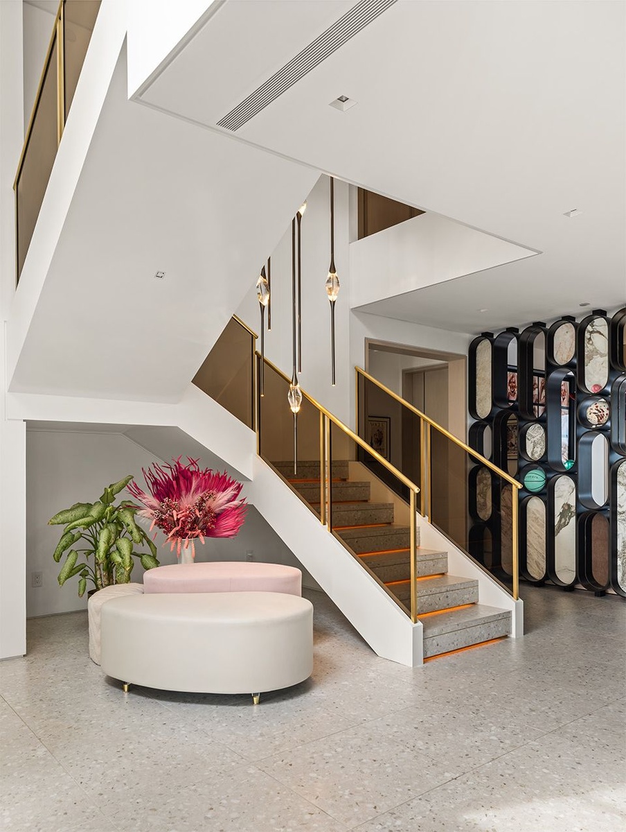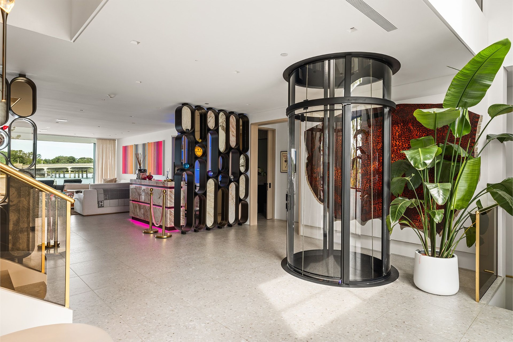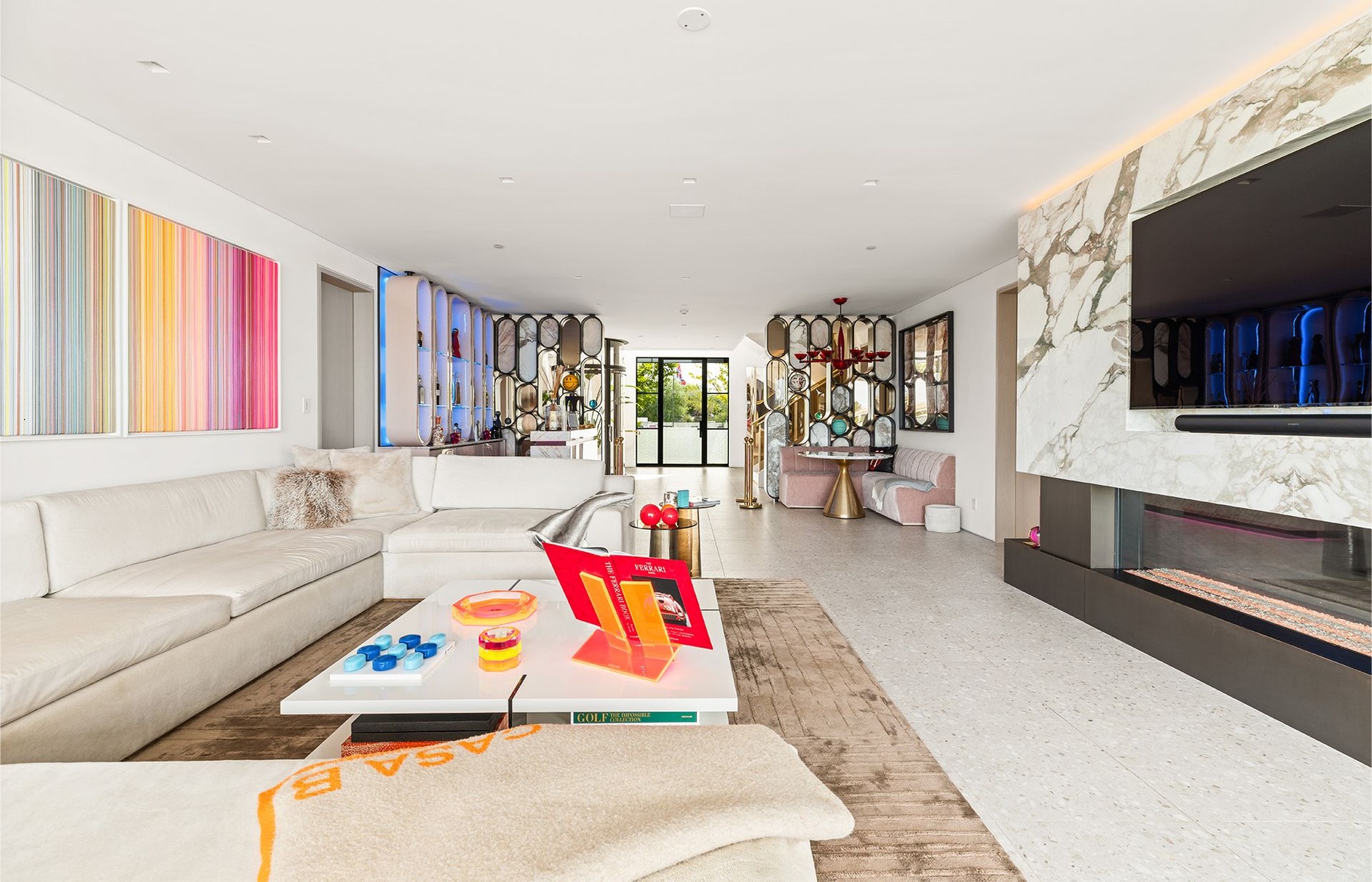 Spanning an impressive 16,974 square feet across four levels, the estate is conceived as a vertical sanctuary where grand-scale entertaining and intimate retreat coexist effortlessly. Interiors encompass approximately 12,551 square feet of meticulously designed living space, defined by a palette of organic textures, refined finishes, and state-of-the-art systems. The residence offers eight expansive bedroom suites and ten beautifully appointed baths, thoughtfully arranged to accommodate family, guests, and live-in staff with complete comfort and privacy.