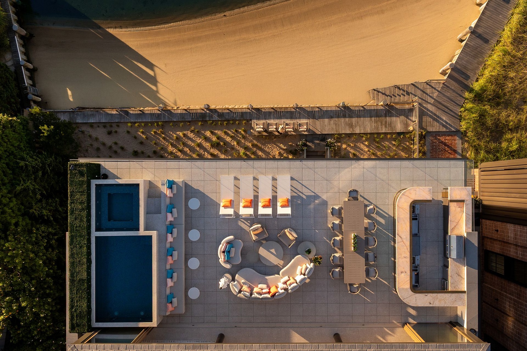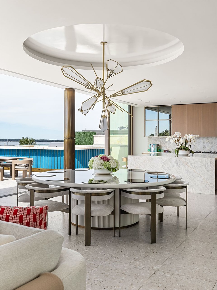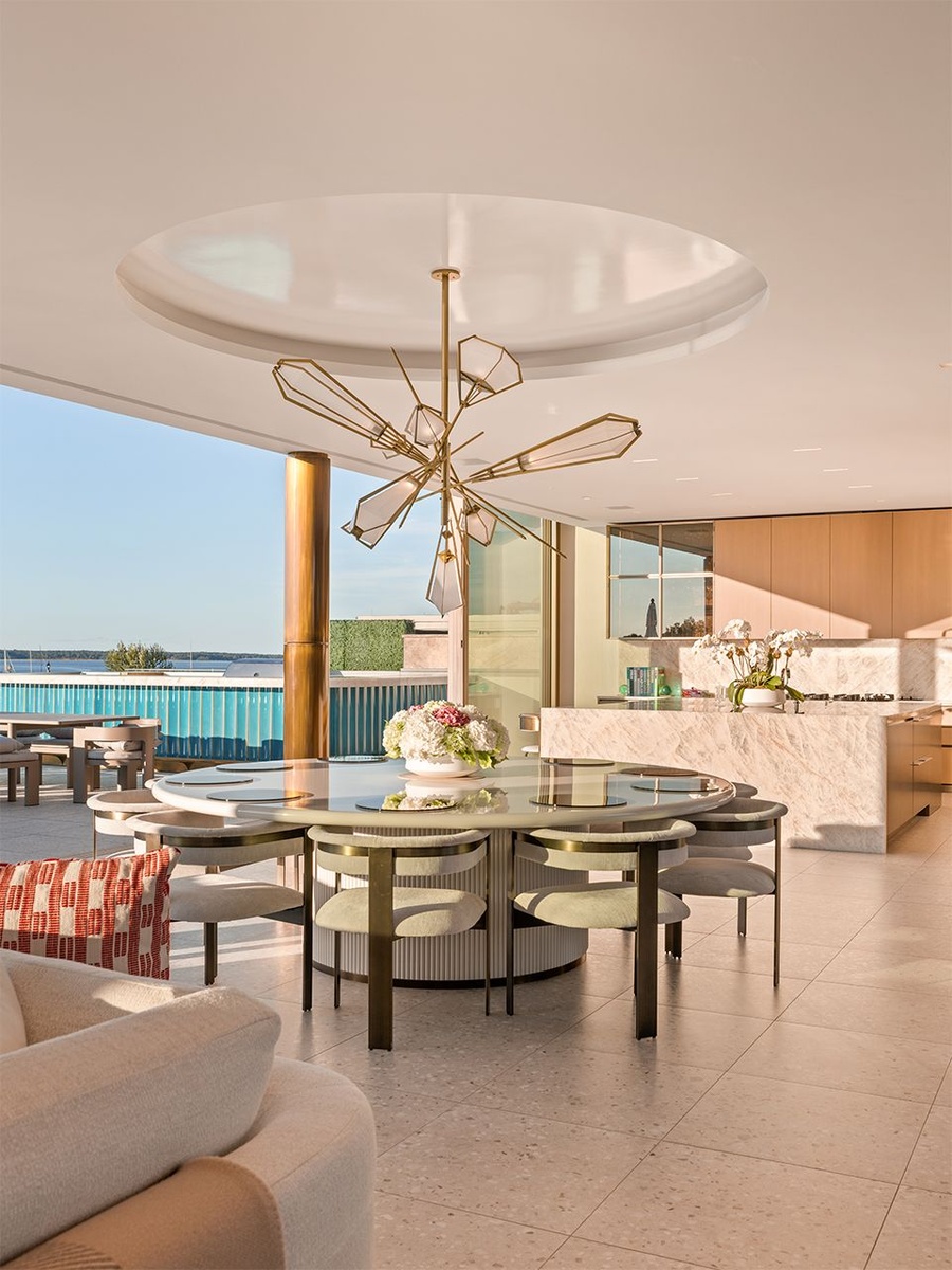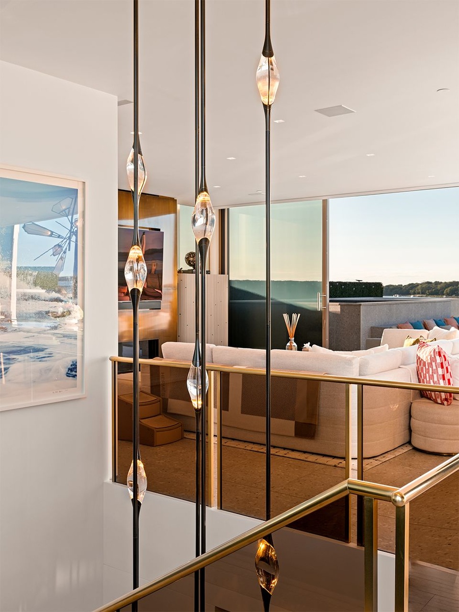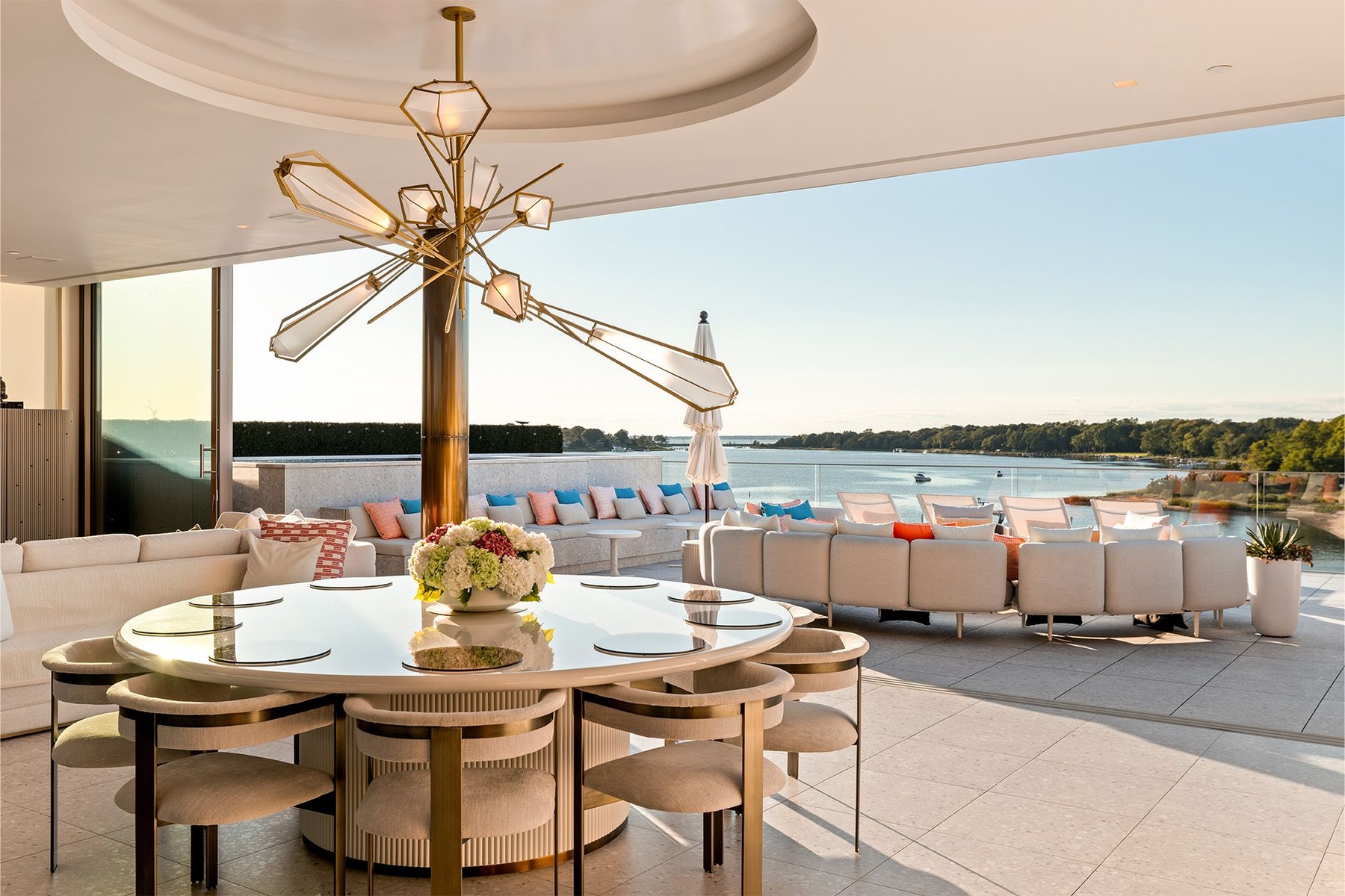 Outdoor living unfolds across multiple levels of tiered terraces and lounge decks, creating a dynamic al fresco experience that keeps the water constantly within view. At the pinnacle, a private rooftop sanctuary serves as a crowning architectural achievement — featuring a pool and spa seemingly suspended above the harbor, offering uninterrupted 360-degree vistas and breathtaking sunset views across Sag Harbor’s golden coastline.