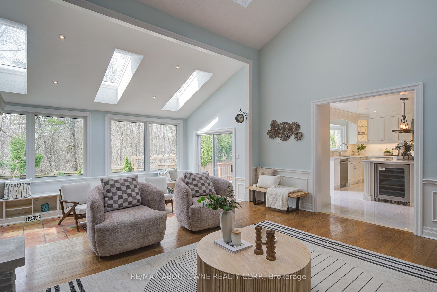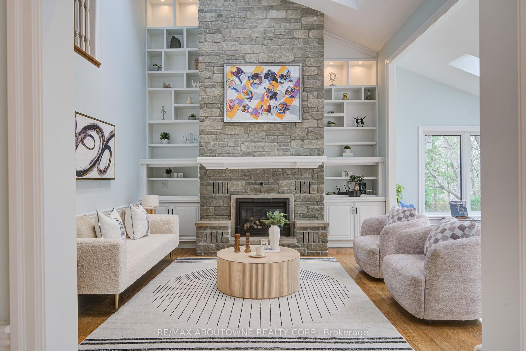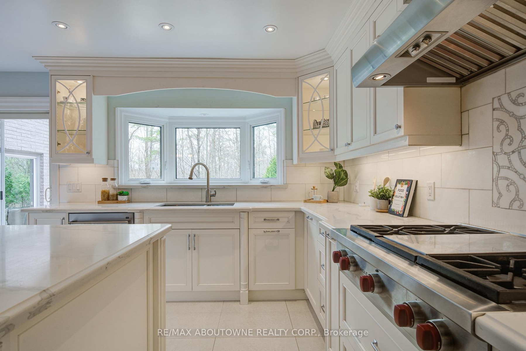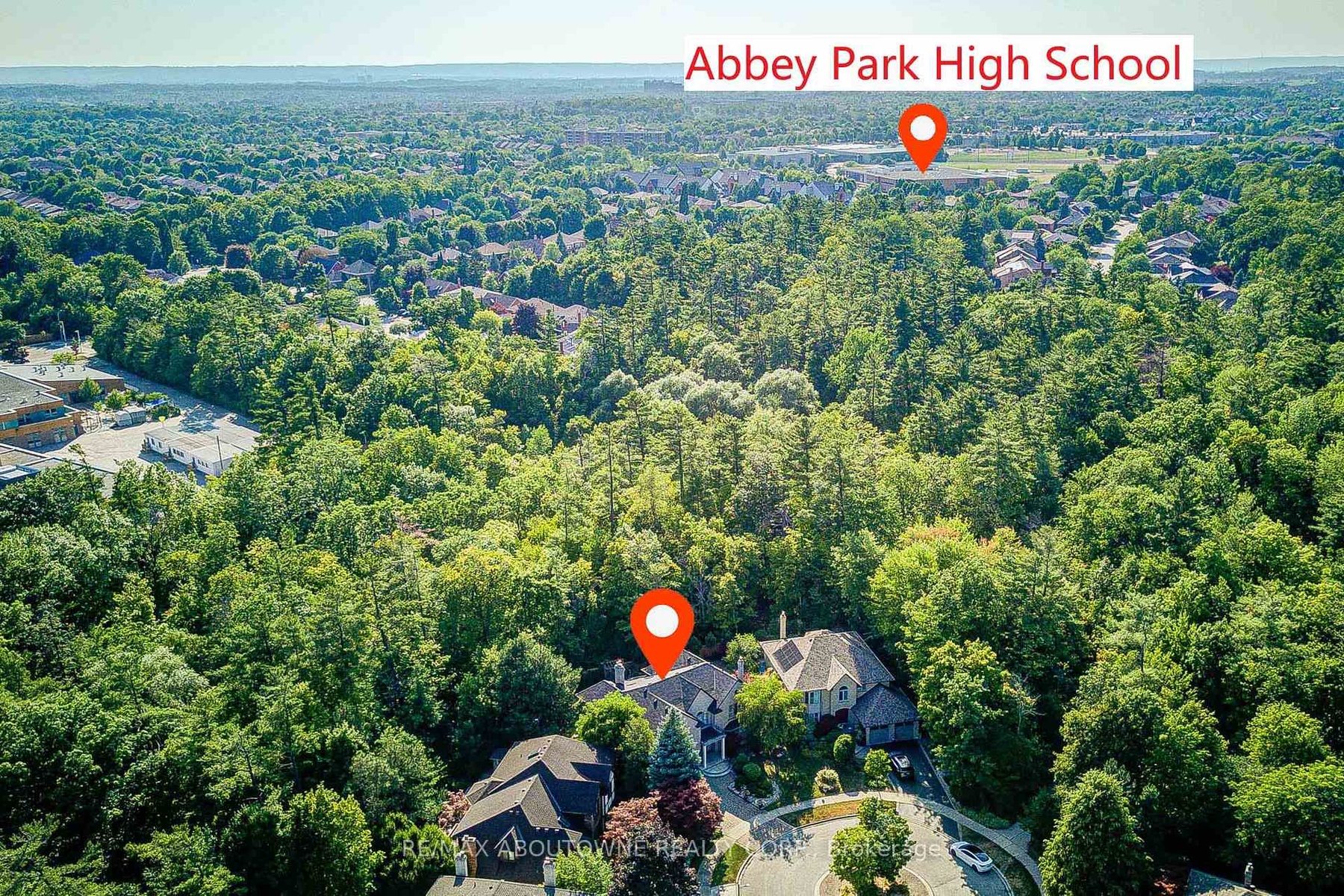 Enclaved in the woods, nestled on a ultra-premium ravine lot in an exclusive four-home cul-de-sac, this custom Dalzotto-built estate offers approximately 4,000 sf above-grade living space, highlighted by a full-stone exterior, professionally interlocked driveway, landscaped backyard, all within walking distance to top-rated schools such as Pilgrim Wood PS &Abbey Park HS. Designed for both entertaining and everyday living, the main floor features a bright foyer leading to formal living and dining rooms, while the impressive family room showcases 17-foot sloped ceilings, five skylights, a dramatic floor-to-ceiling gas fireplace that flows into a sun-filled solarium. The chef's kitchen, renovated in 2016, with custom cabinetry, large center island, premium appliances, including Sub-Zero 36" freezer ,36"fridge set, a Wolf 36" hood w/wall mount blower ,Wolf gas cooktop, a double oven, an Asko dishwasher, a Sharp under-counter microwave. The upper level offers four spacious bedrooms with floor-to-ceiling windows, including a primary suite with a walk-in closet w/ luxurious 5-piece ensuite, two bedrooms connected by a Jack&Jill 5-piece bathroom, a fourth bedroom with its own private 4-piece ensuite. The expansive lower level, with a separate entrance, adds exceptional versatility with a large recreation room, a games room, a fifth bedroom or den with a 4-piece bath, a cold room, ample storage. The private backyard retreat features over 135 feet of ravine frontage a saltwater heated pool with a new liner (21), a 1.5 HP pump (23), an updated sand filter (23), along with additional upgrades such as a new deck ,BBQ (16), backyard fence, two wood sheds (19), back & side triple-pane window replacements (21), owned hot water tank (25). Attic Insulation upgrade (21). An upgraded gas meter supports multiple features simultaneously, including two gas fireplaces, a gas stove, fire pit, BBQ, two furnaces, ensuring this exceptional home delivers luxury , outstanding performance.