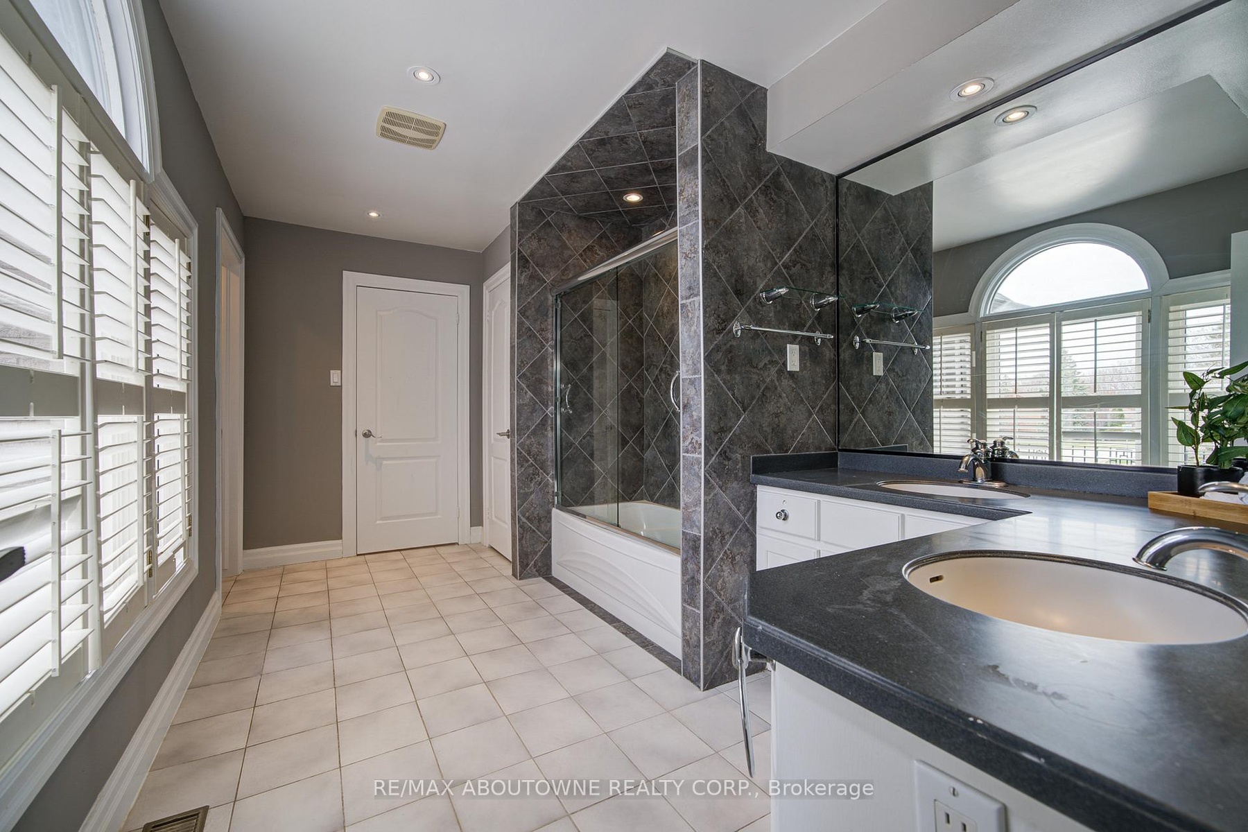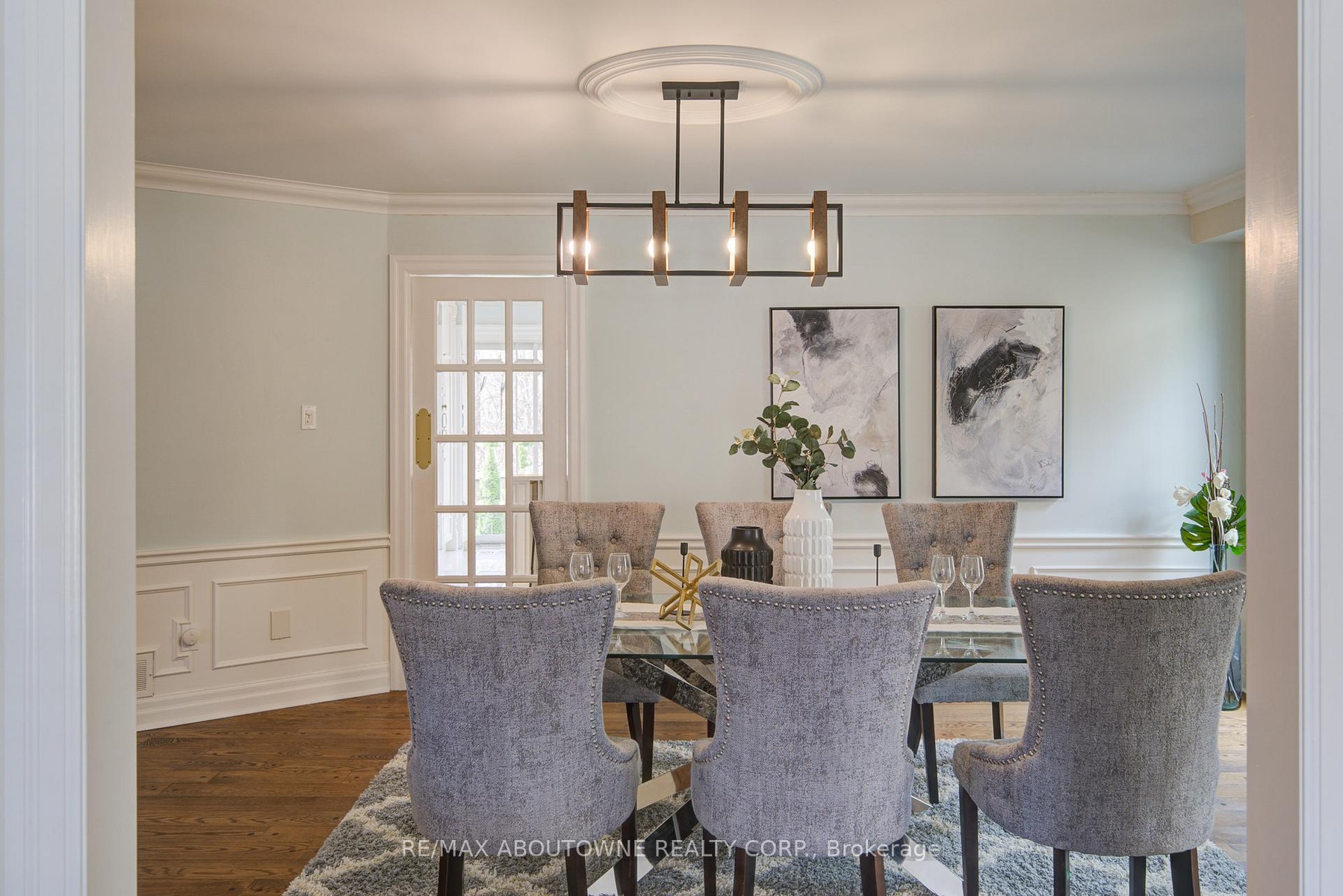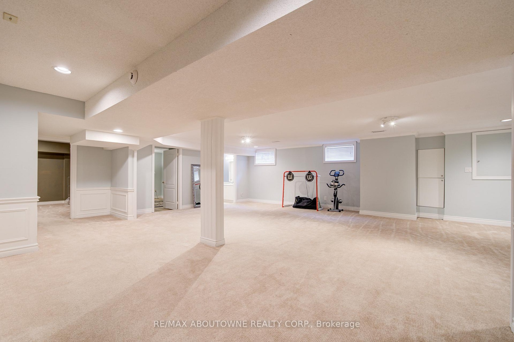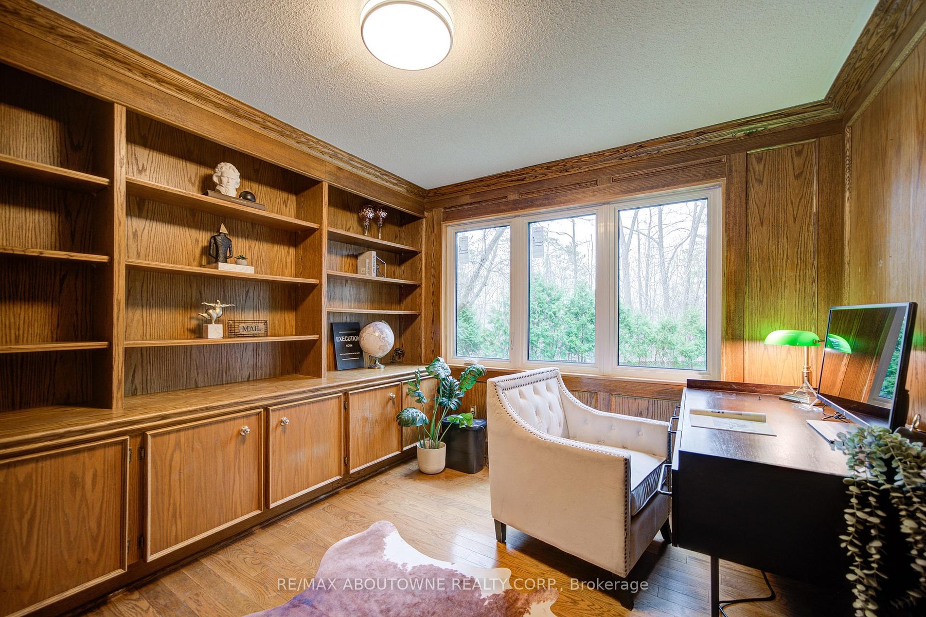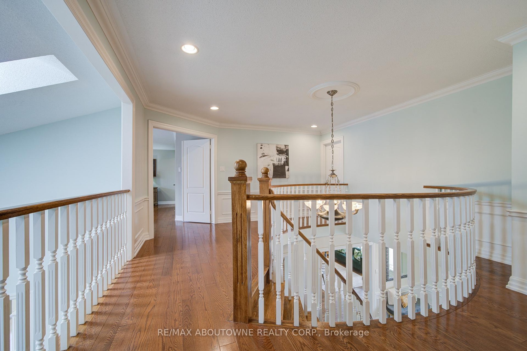 Enclaved in the woods, nestled on a ultra-premium ravine lot in an exclusive four-home cul-de-sac, this custom Dalzotto-built estate offers approximately 4,000 sf above-grade living space, highlighted by a full-stone exterior, professionally interlocked driveway, landscaped backyard, all within walking distance to top-rated schools such as Pilgrim Wood PS &Abbey Park HS. Designed for both entertaining and everyday living, the main floor features a bright foyer leading to formal living and dining rooms, while the impressive family room showcases 17-foot sloped ceilings, five skylights, a dramatic floor-to-ceiling gas fireplace that flows into a sun-filled solarium. The chef's kitchen, renovated in 2016, with custom cabinetry, large center island, premium appliances, including Sub-Zero 36" freezer ,36"fridge set, a Wolf 36" hood w/wall mount blower ,Wolf gas cooktop, a double oven, an Asko dishwasher, a Sharp under-counter microwave. The upper level offers four spacious bedrooms with floor-to-ceiling windows, including a primary suite with a walk-in closet w/ luxurious 5-piece ensuite, two bedrooms connected by a Jack&Jill 5-piece bathroom, a fourth bedroom with its own private 4-piece ensuite. The expansive lower level, with a separate entrance, adds exceptional versatility with a large recreation room, a games room, a fifth bedroom or den with a 4-piece bath, a cold room, ample storage. The private backyard retreat features over 135 feet of ravine frontage a saltwater heated pool with a new liner (21), a 1.5 HP pump (23), an updated sand filter (23), along with additional upgrades such as a new deck ,BBQ (16), backyard fence, two wood sheds (19), back & side triple-pane window replacements (21), owned hot water tank (25). Attic Insulation upgrade (21). An upgraded gas meter supports multiple features simultaneously, including two gas fireplaces, a gas stove, fire pit, BBQ, two furnaces, ensuring this exceptional home delivers luxury , outstanding performance.