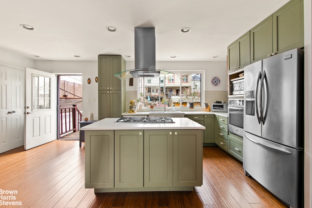 Enter the owner's triplex to a large open living/ dining space with a state-of-the-art, modern kitchen, and access to an enormous, lush native garden. The grand living room offers a perfect space for relaxation and includes a sizable dining area perfect for entertaining guests. The well-designed kitchen, in the heart of the home features: an apron sink, solid wood Schuyler custom cabinetry, many special built ins, a vertical oven and microwave, a Frigidaire refrigerator, Bosche stove, center island and a GE dishwasher.