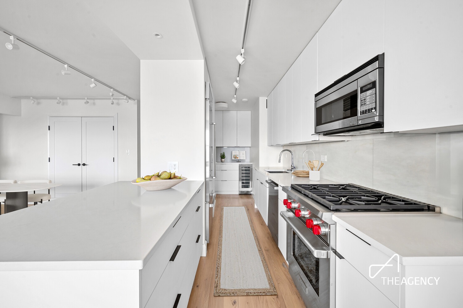 Positioned on a high floor, the apartment is filled with natural light and offers stunning sunset views. The layout is both functional and inviting, featuring a large living room with a dedicated dining alcove and a seamless flow into the open kitchen. Designed with both style and practicality in mind, the kitchen is equipped with Sub Zero and Wolf appliances, a Bosch dishwasher, and elegant finishes. Both bathrooms have been tastefully renovated with a timeless aesthetic, and hardwood floors run throughout the home. Generous closet space adds to the overall ease and everyday livability. The king sized primary suite offers excellent storage and a private en suite bath, while the second bedroom is spacious and versatile.