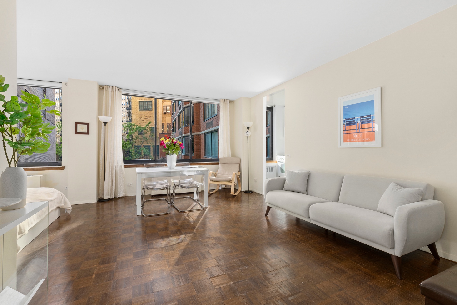 Enjoy a sun-drenched Upper West Side oasis overlooking a sweet and quiet courtyard. A separate windowed kitchen and generous proportions elevate everyday living beyond the typical studio experience. The kitchen has full-sized appliances including a large gas stove and dishwasher. There is ample closet space, with a coat closet and two large bedroom closets. The marbled bathroom is appointed with a tub and plenty of storage in the vanity and additional medicine cabinet. Large windows and hardwood floors complete the apartment.