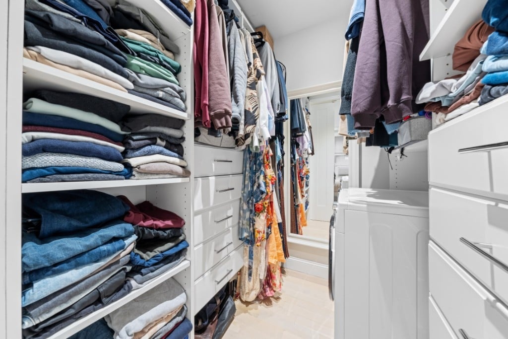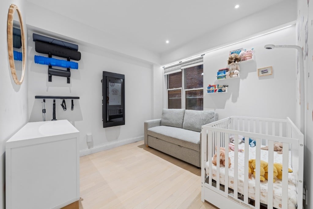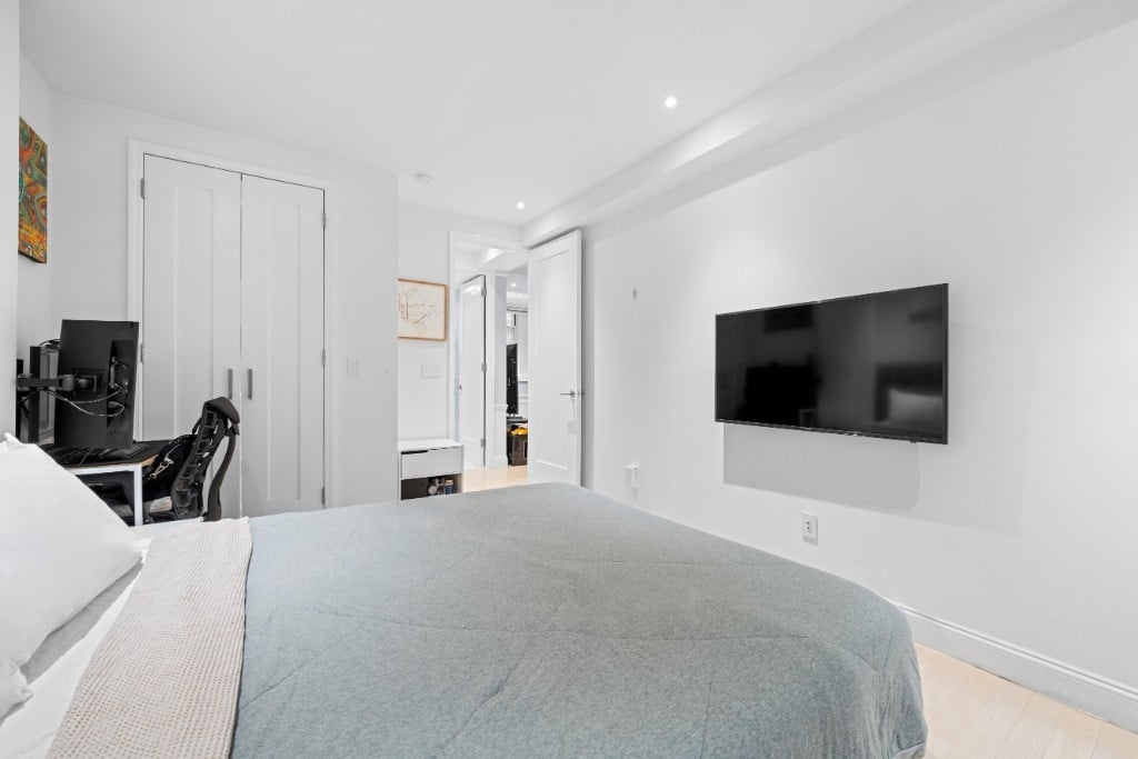 The master bedroom faces the rear of the building for incredible quiet, complete with a walk-in closet featuring custom built-ins and a GE washer/dryer combo unit. Just outside is a spa-like bath with Carrera marble tiles, Toto toilet, and Kohler fixtures with a digitally controlled overhead rain shower. The second bedroom, located on the opposite side of the apartment, is equally peaceful. Additional conveniences include Tonal all-in-one home gym equipment and LED recessed lighting with Lutron dimming controls.