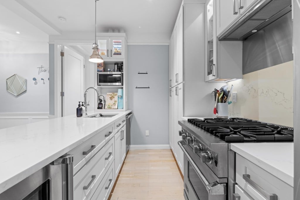 Upon entering, a magnificent kitchen welcomes you with a breakfast bar, Caesarstone countertops, pendant lighting, and premium Viking appliances including refrigerator, stove, dishwasher, microwave, and wine cooler. The layout opens to a bright living area with southern light and one-way window film on the windows for added privacy.