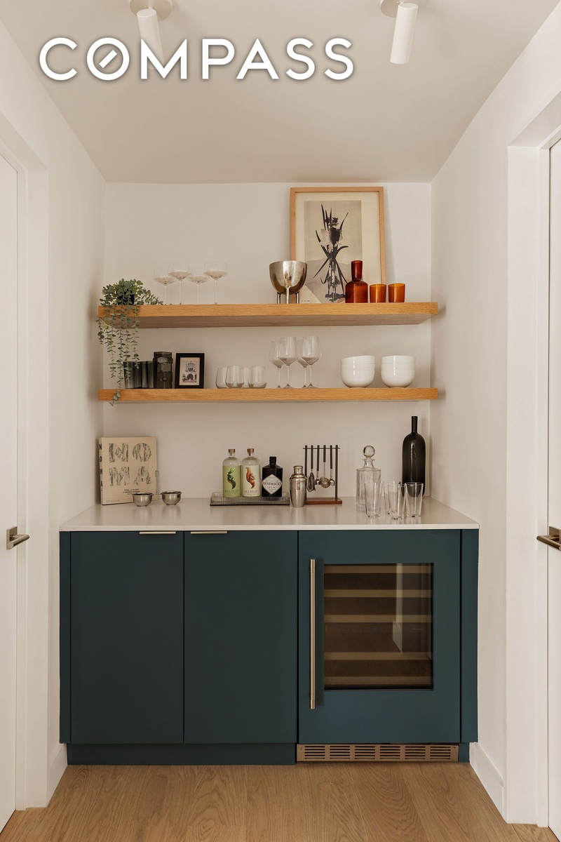 The kitchen, with its custom-milled cabinetry, is superbly outfitted with Miele, Thermador, and Bertazzoni appliances. A pantry delivers additional storage, and a bar area with floating white oak shelves and a wine refrigerator add to the home’s effortless entertaining appeal.