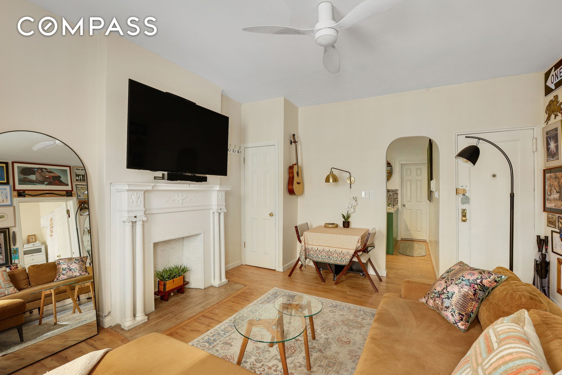 This north-facing pre-war one-bedroom seamlessly combines charm, modern updates, and a prime Upper West Side location. When you walk into the apartment, you're welcomed by a spacious living room filled with natural reflective sunlight. A decorative fireplace, a corner closet, and an elegant arched entryway to the kitchen add classic pre-war character to the space. All window treatments feature custom Hunter Douglas Roman shades.
