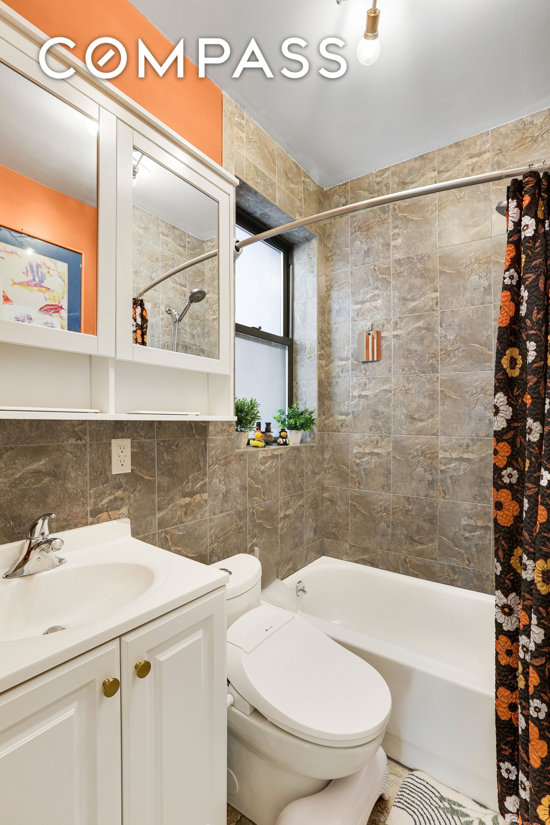 A tiled bathroom with a soaking tub and dual-flush toilet completes the interior, which is further enhanced by high ceilings and refinished hardwood floors.