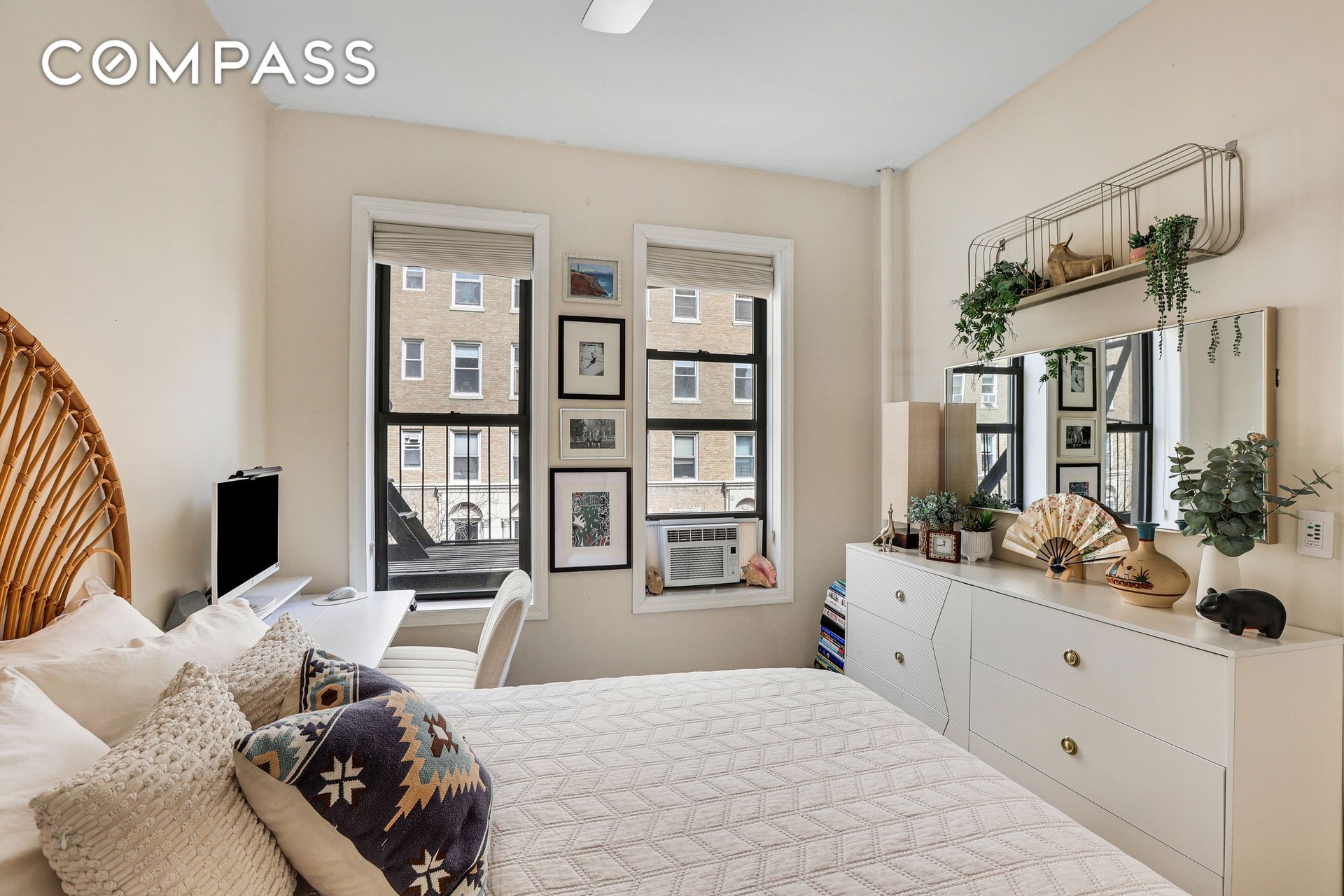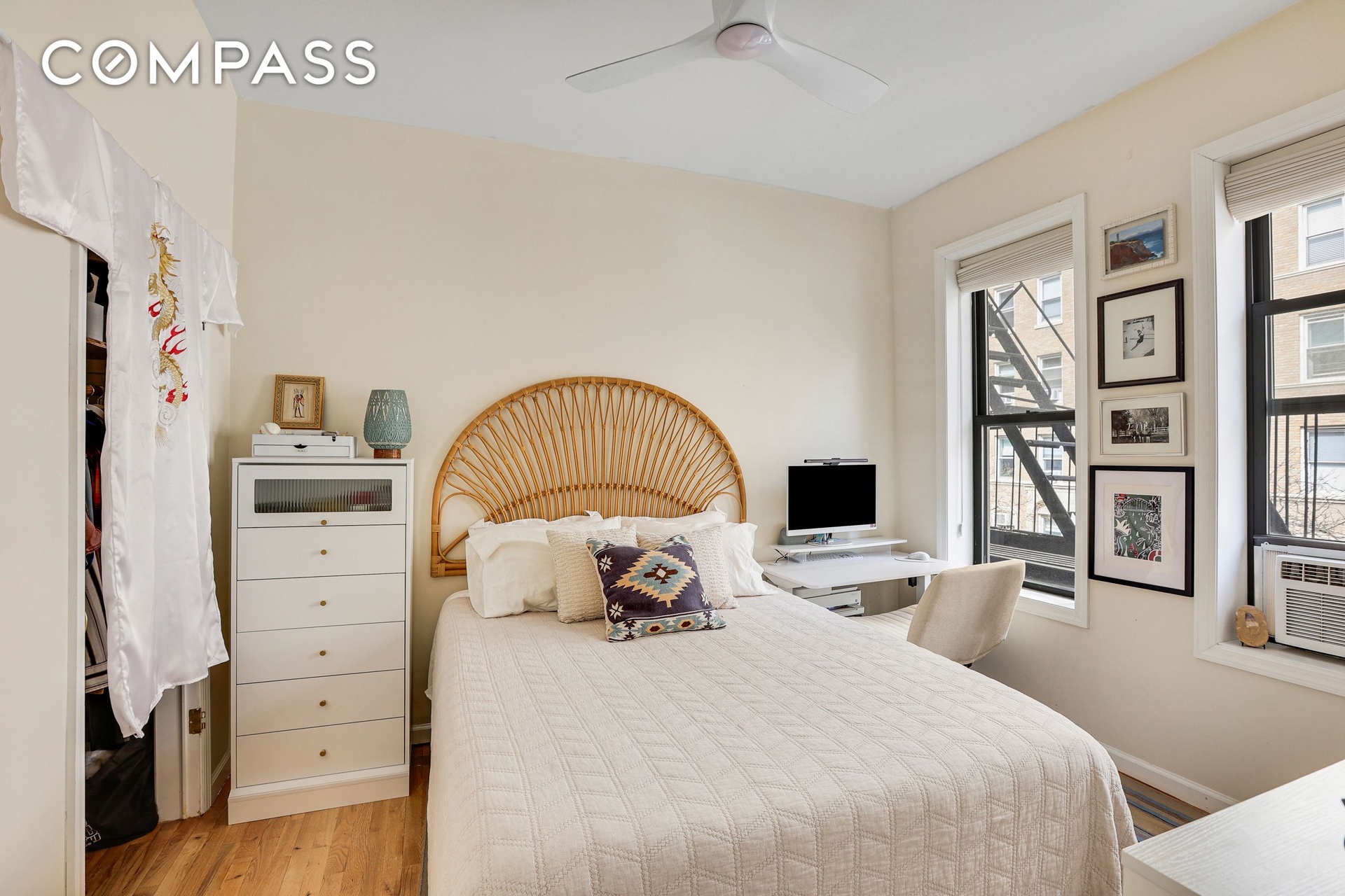 The bedroom comfortably fits a queen-sized bed and offers two north-facing windows with blackout shades, along with two large floor-to-ceiling closets that can be combined for extra storage.