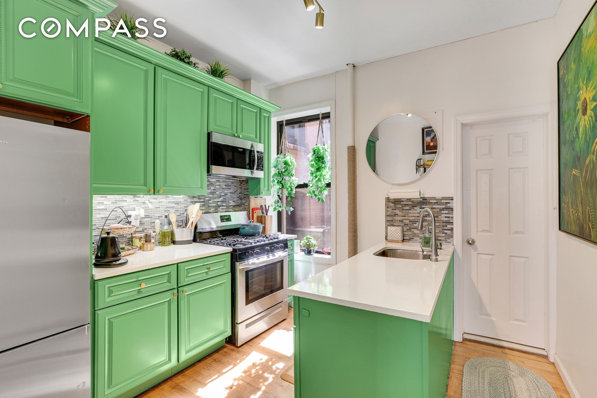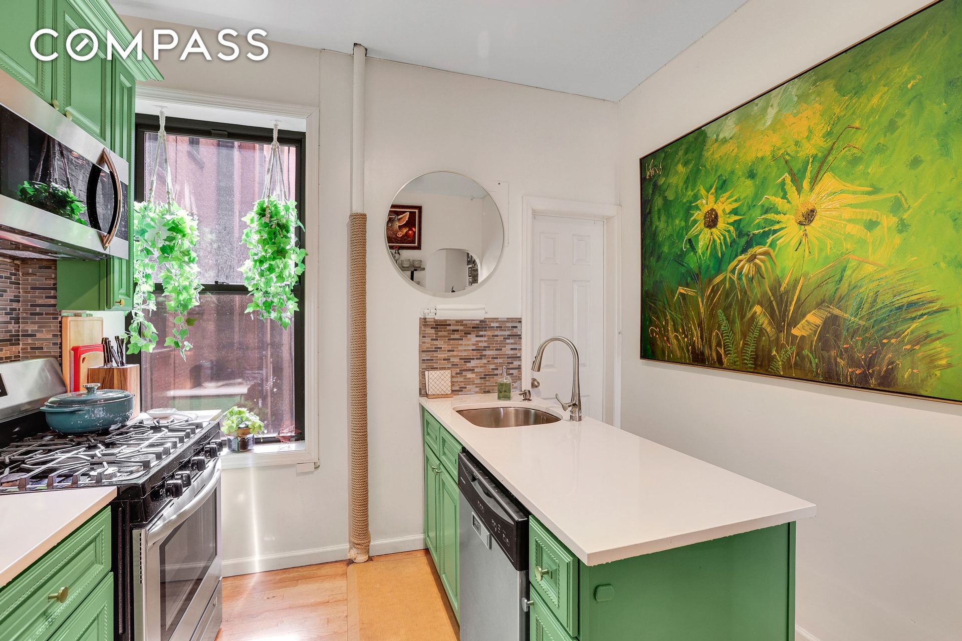 The thoughtfully designed, windowed kitchen has two stone countertops—one with a large sink and the other providing ample prep space beneath sleek cabinetry. It’s equipped with stainless steel appliances, including a Fisher & Paykel refrigerator, a Frigidaire dishwasher, a microwave, and an oven.