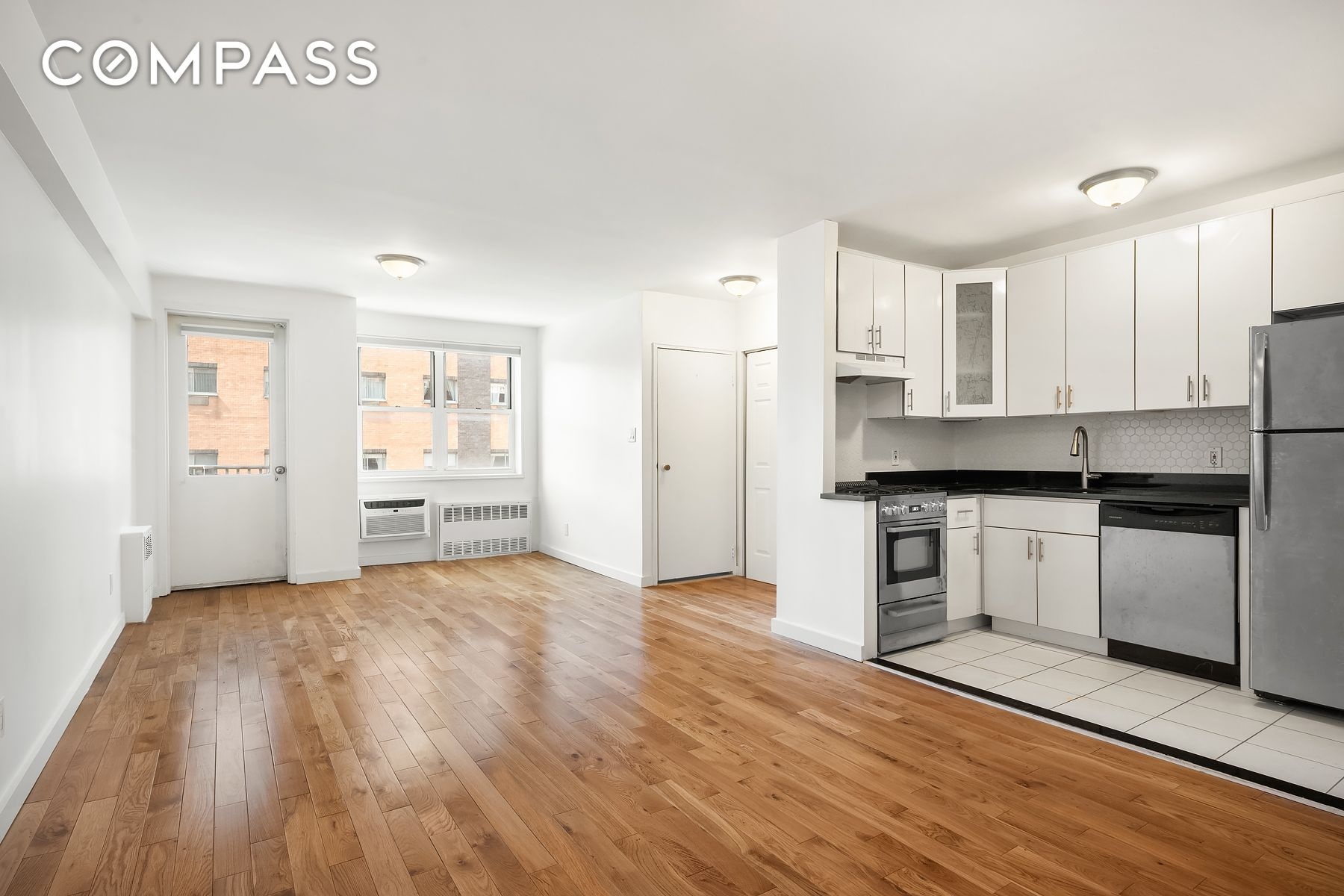 The open living area allows for clear separation between sleeping and living zones. A fully separate partially renovated kitchen of generous size supports everyday cooking with ample storage space and a windowed bathroom. The apartment lastly has two large closets provide excellent storage—an uncommon feature for a studio.