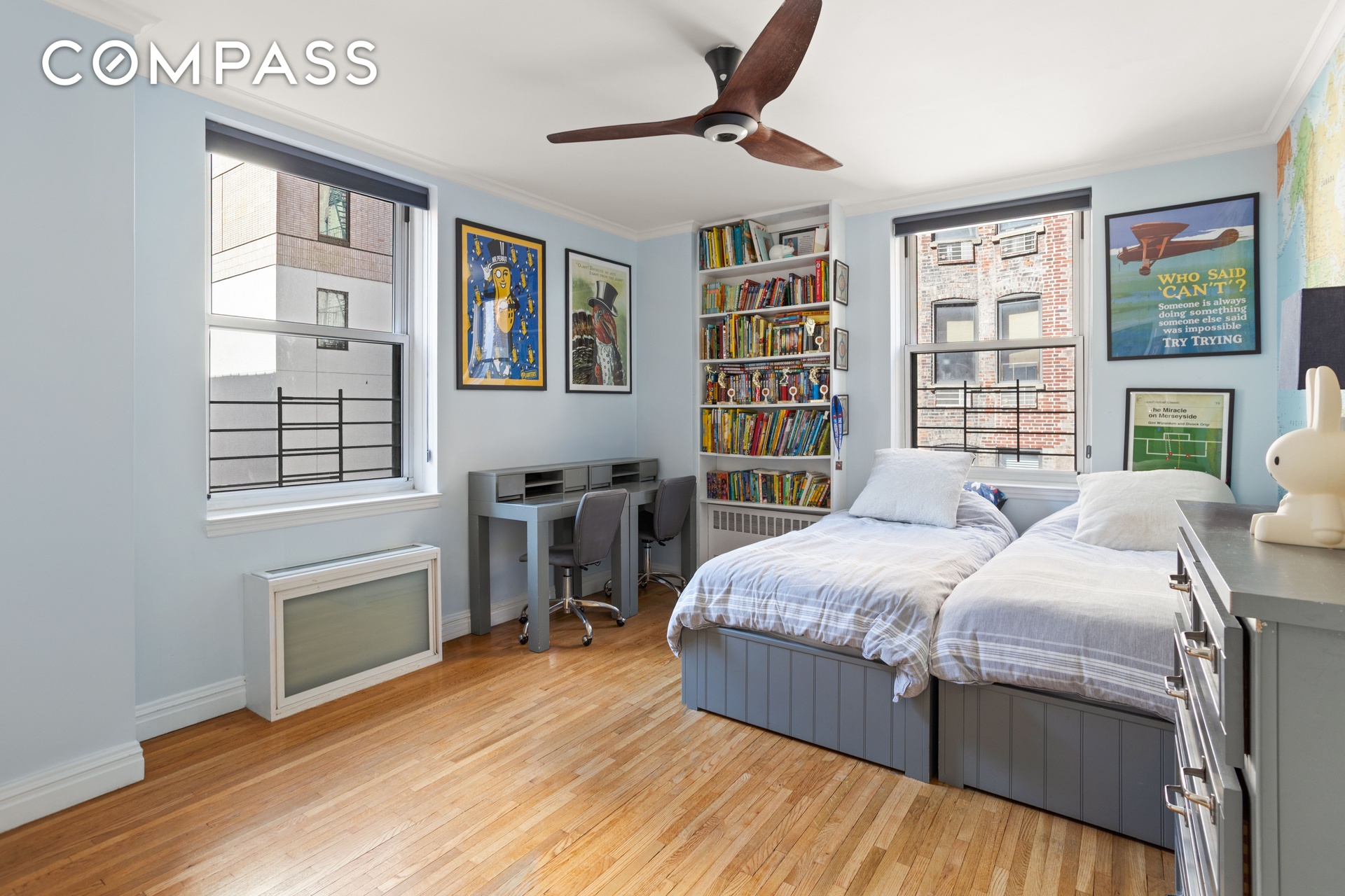 Enter this lovely home and immediately be greeted by beautiful prewar details, including an expansive custom wooden built in bookcase, moldings, oak hardwood flooring, and more.