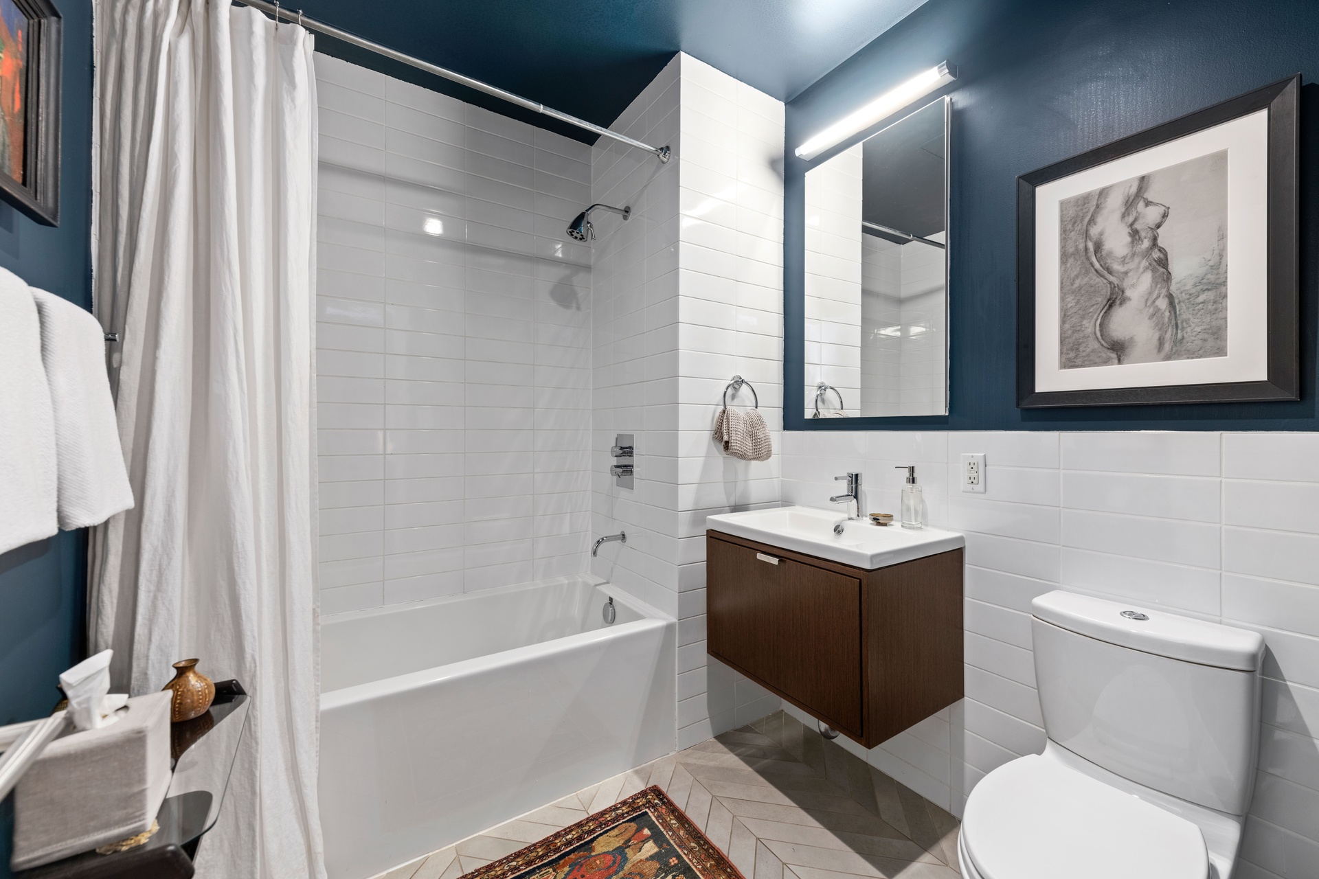 The main suite boasts of floor to ceiling ceramic penny tile bathroom and shower enclosure, custom designed vanity fabricated in Breccia Capraia marble stone, radiant floor heating throughout the bathroom and a custom solid wood dual closet with built-in dressers. The custom steel stair railing designed and fabricated by Toby Upton leads you to the spacious lower living space. This inviting space features a family room, half bath and a second bedroom/nursery with a solid red oak sliding door.