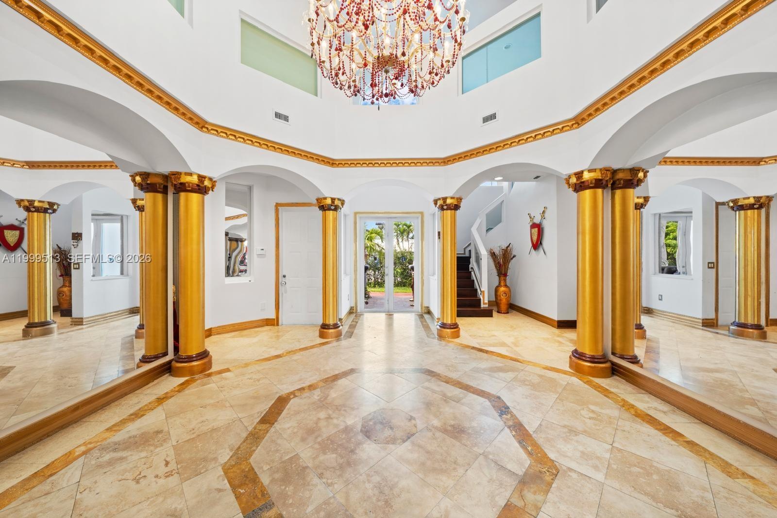 Welcome to this exquisite Mediterranean estate, where elegance meets comfort in a thoughtfully designed 5-bedroom, 4-bath residence featuring two luxurious primary suites. From the moment you enter, you’re greeted by soaring vaulted triple tray ceilings and gleaming marble floors that set the tone for refined living.