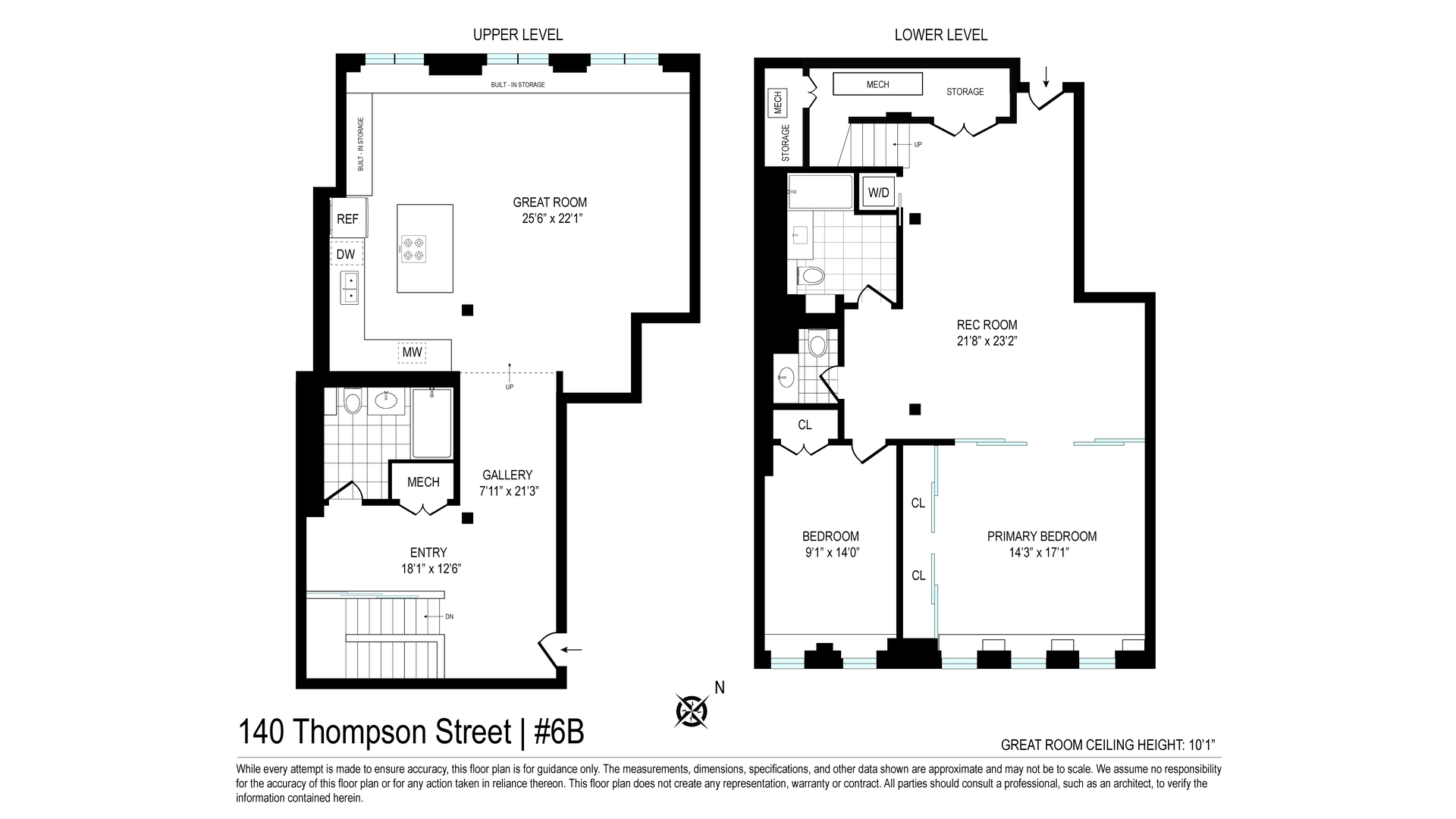 140 Thompson Street is a prewar gem built for the Marvin Safe Co. in 1903. It became a cooperative in 1978. This location is at the cross section of Soho and the West Village. Apartment 6B is a large loft-style duplex with just over 2000 square feet. The upstairs features an enormous open living room/dining room facing West with incredible light and unobstructed views. The open concept kitchen has Miele appliances and great storage space. There is a full bathroom upstairs. The apartment has retained some lovely prewar details such as rough hewn wood columns, brickwork walls, 10' ceilings, and an original entry way door frame from a bygone era. Downstairs offers a flexible layout with two nice sized bedrooms, a full bathroom and a half bathroom, a washer dryer, terrific closet space and East exposure.