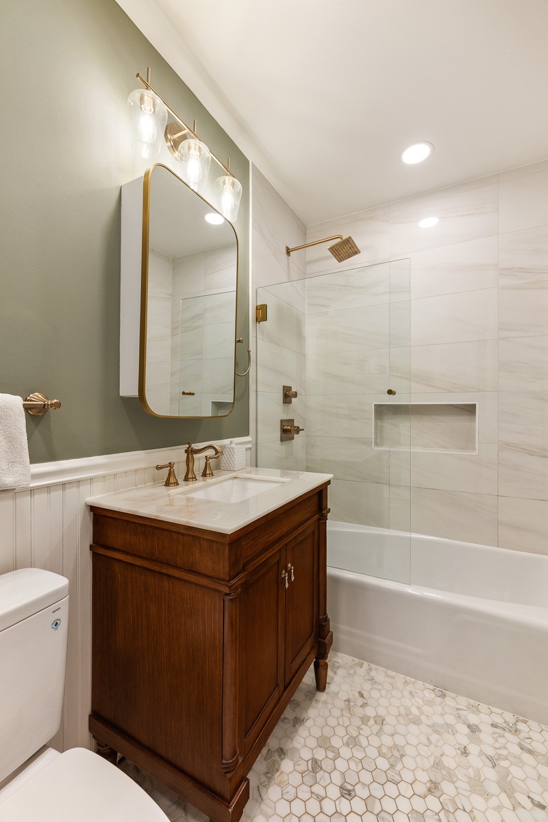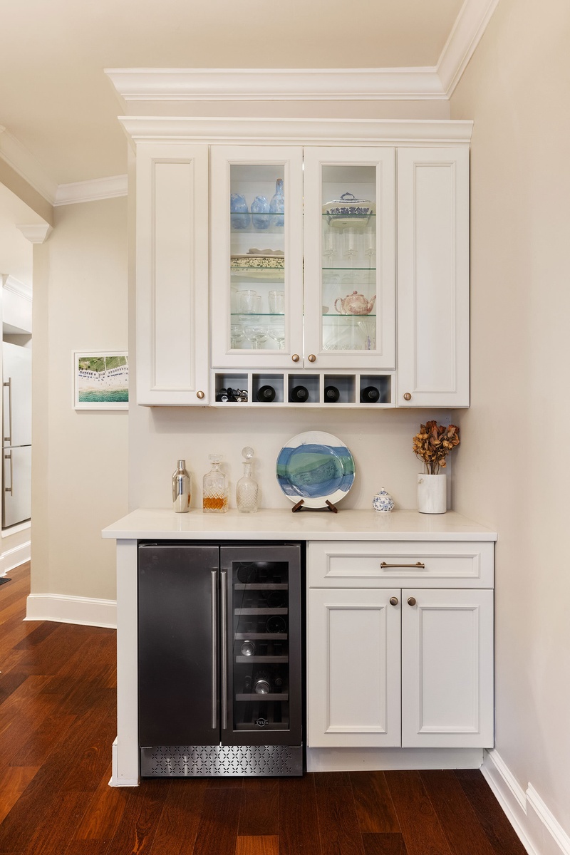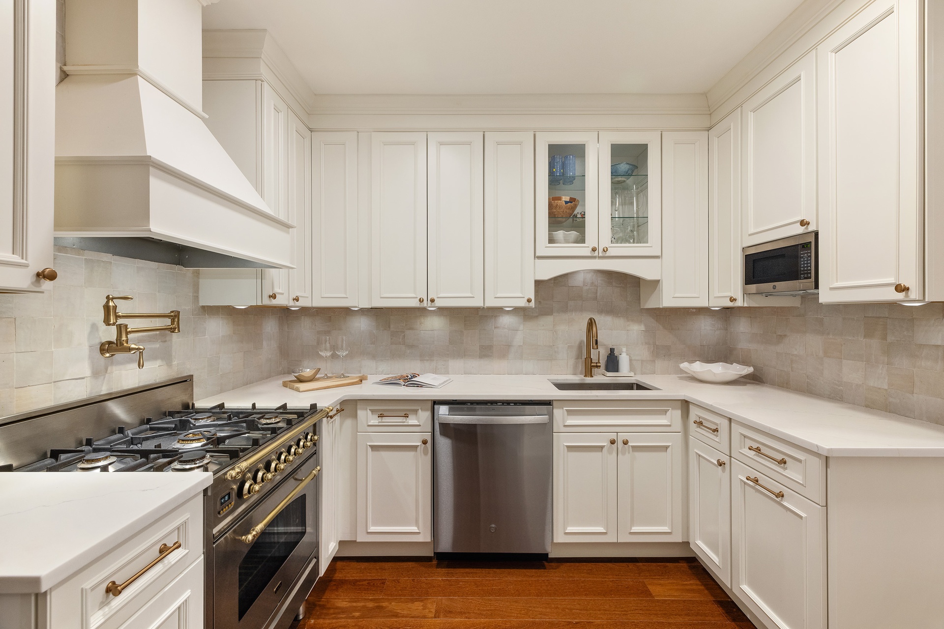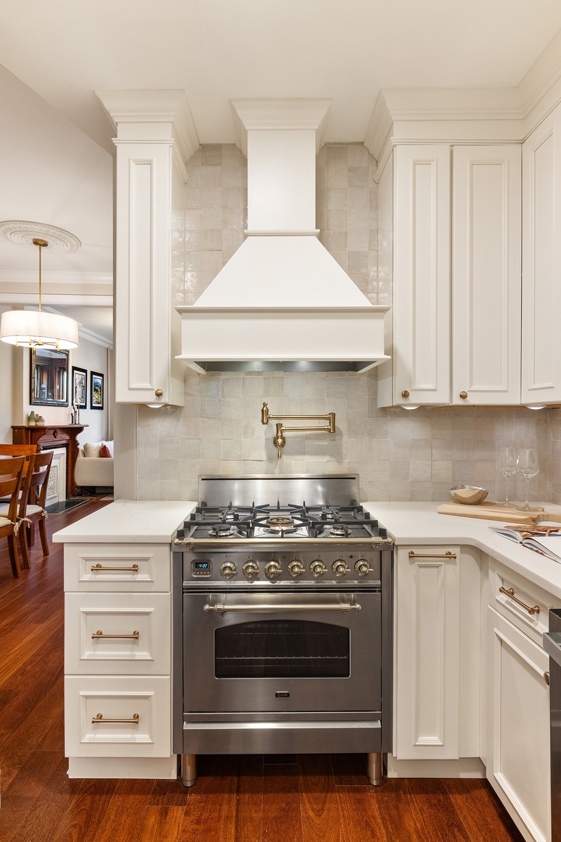 The sun-filled living room features a bay window, original fireplace, and rich hardwood floors. A separate dining area flows into a custom kitchen with white shaker cabinetry, quartz countertops, and a standout Ilve range.