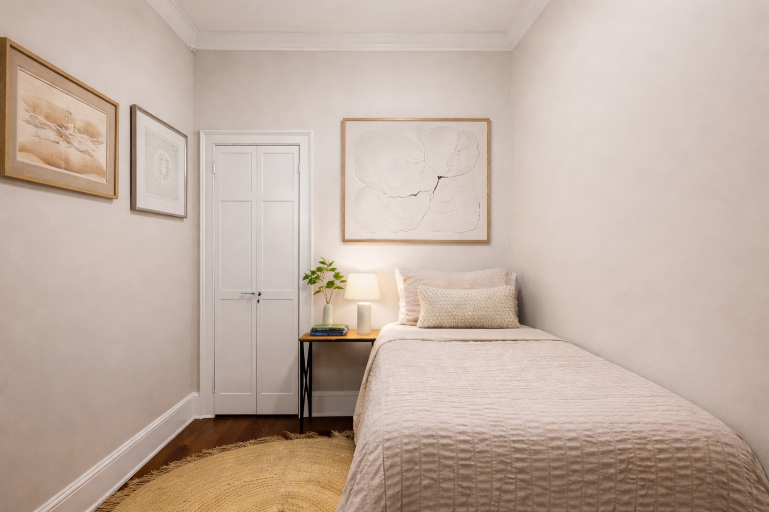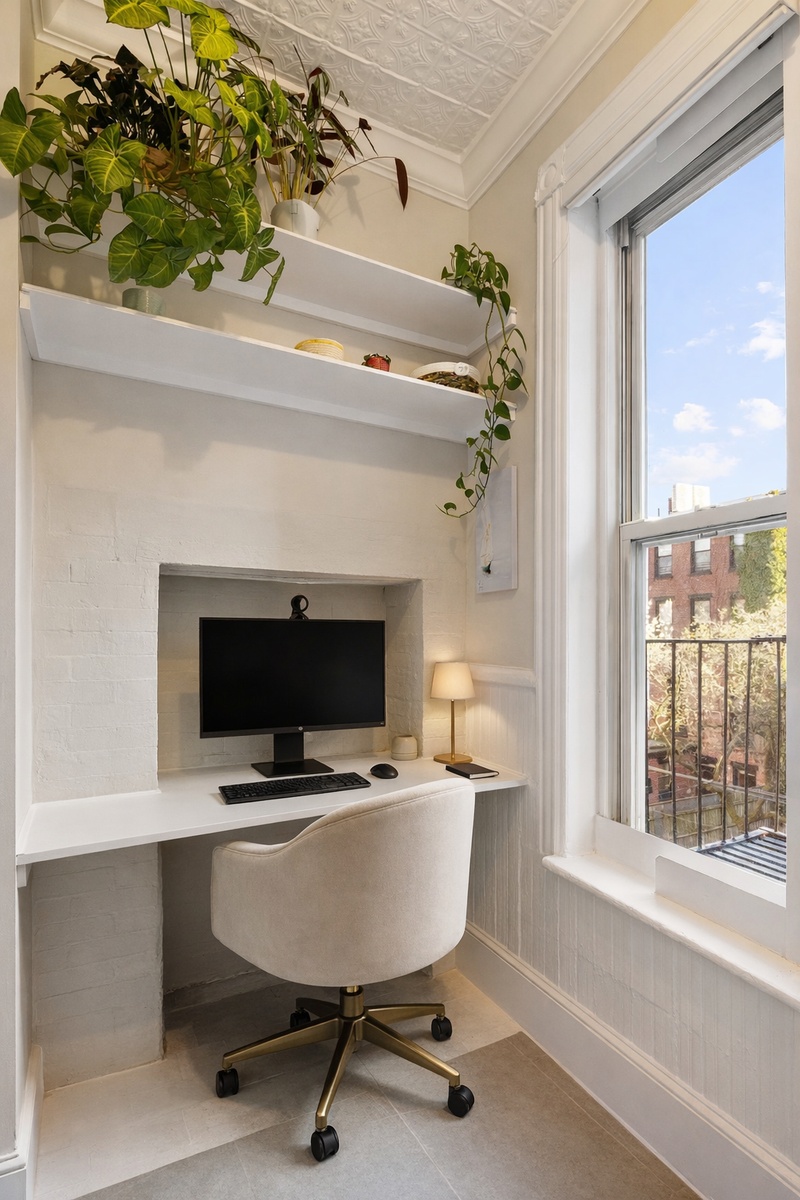 The primary bedroom has exposed brick, a Hearth Cabinet smokeless fireplace, brass sconces, motorized blinds, and exceptional storage — a walk-in closet and an additional closet, both with custom Elfa systems. The second bedroom is privately situated with ample storage. The bathroom features imported Italian shower tile, brass hardware, and heated floors.