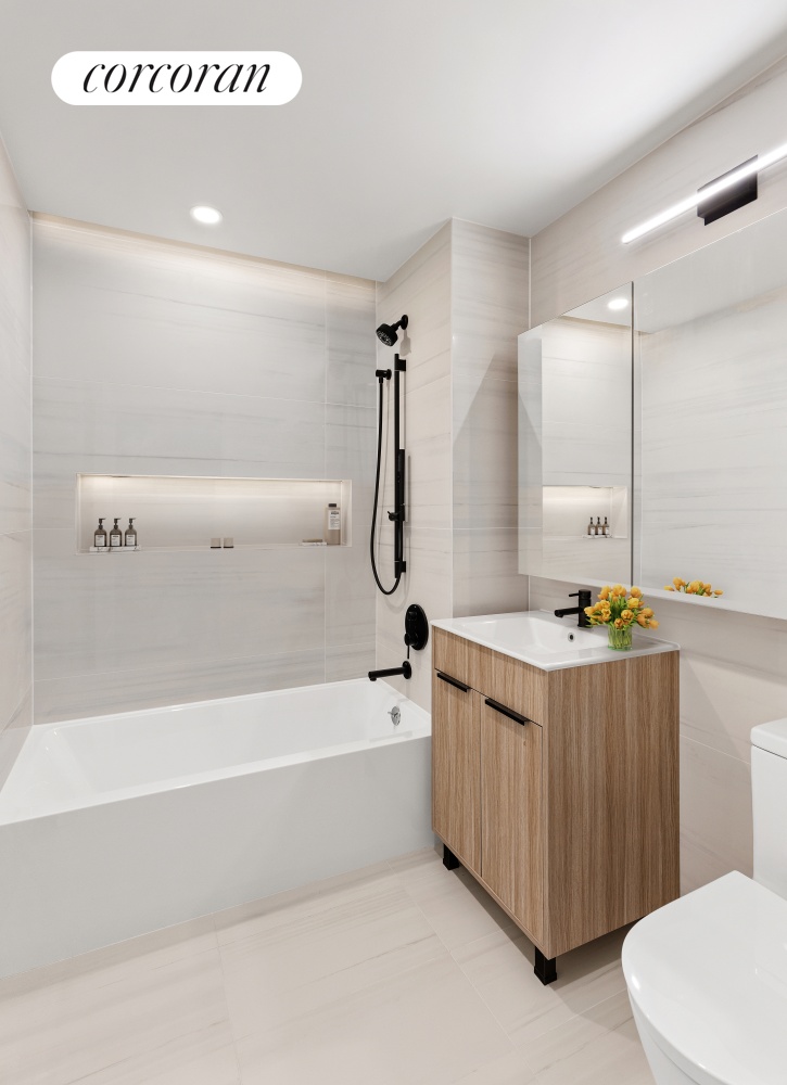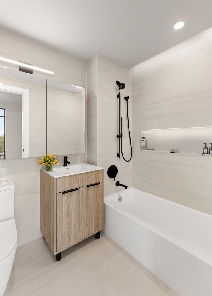 This elegantly designed 617 square foot one-bedroom, one-bathroom condominium residence offers a private balcony and northwestern exposures. Each residence features floor-to-ceiling oversized windows, wide-plank white oak flooring throughout, recessed lighting, high ceilings above 8', and an in-unit washer and dryer.