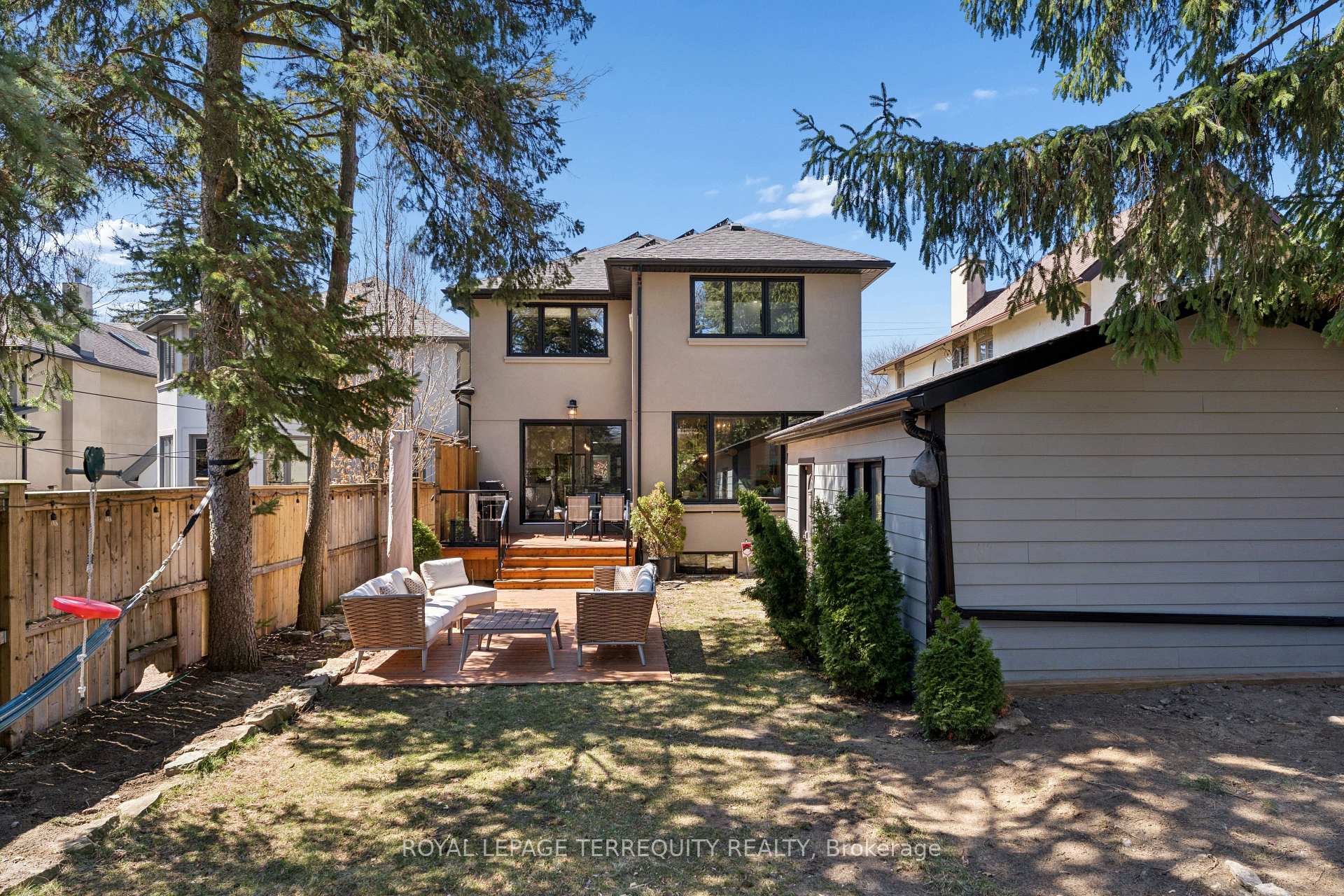 A beautiful, modern home on an exceptional 40 x 187 ft lot with a backyard that feels like your own private park. Nearly two dozen trees, including a dozen mature specimens, lawn, full fencing, and a depth rarely found in the city - private, expansive, and ideal for kids, entertaining, or simply having space to breathe. A move-in ready 4-bedroom home with a bright, open main floor that walks out to the deck and garden. Thoughtful storage throughout, a family room overlooking the yard, and a second living space at the front. Finished basement with excellent flexibility: currently set up as a home theatre, gym, play area, and a 5th bedroom with full bath. Located in Baby Point, a quiet and highly sought-after neighbourhood, steps to the Humber River, parks, playgrounds, and schools (including French immersion), with easy access to TTC, shops, and restaurants. Solar panels under the micro FIT program (through 2038) generate monthly revenue to cover electricity usage, complemented by a Mitsubishi Zuba cold-climate heat pump for efficient year-round comfort, plus an EV charger. A truly rare backyard in the city, paired with a home that's ready to enjoy from day one. Fl plans, inspection, Feature sheet, virtual tour att.