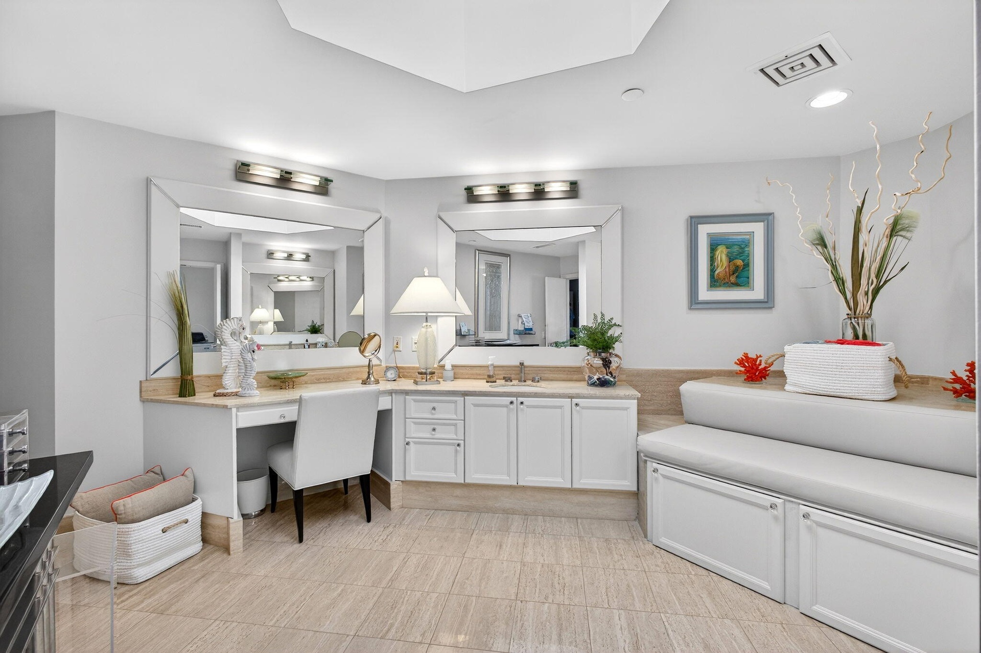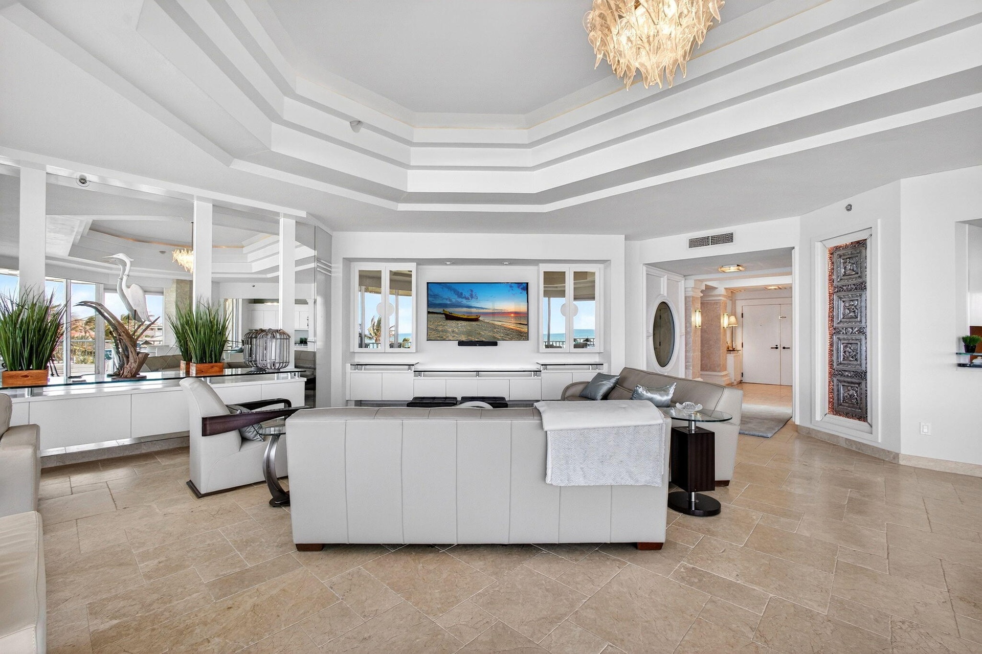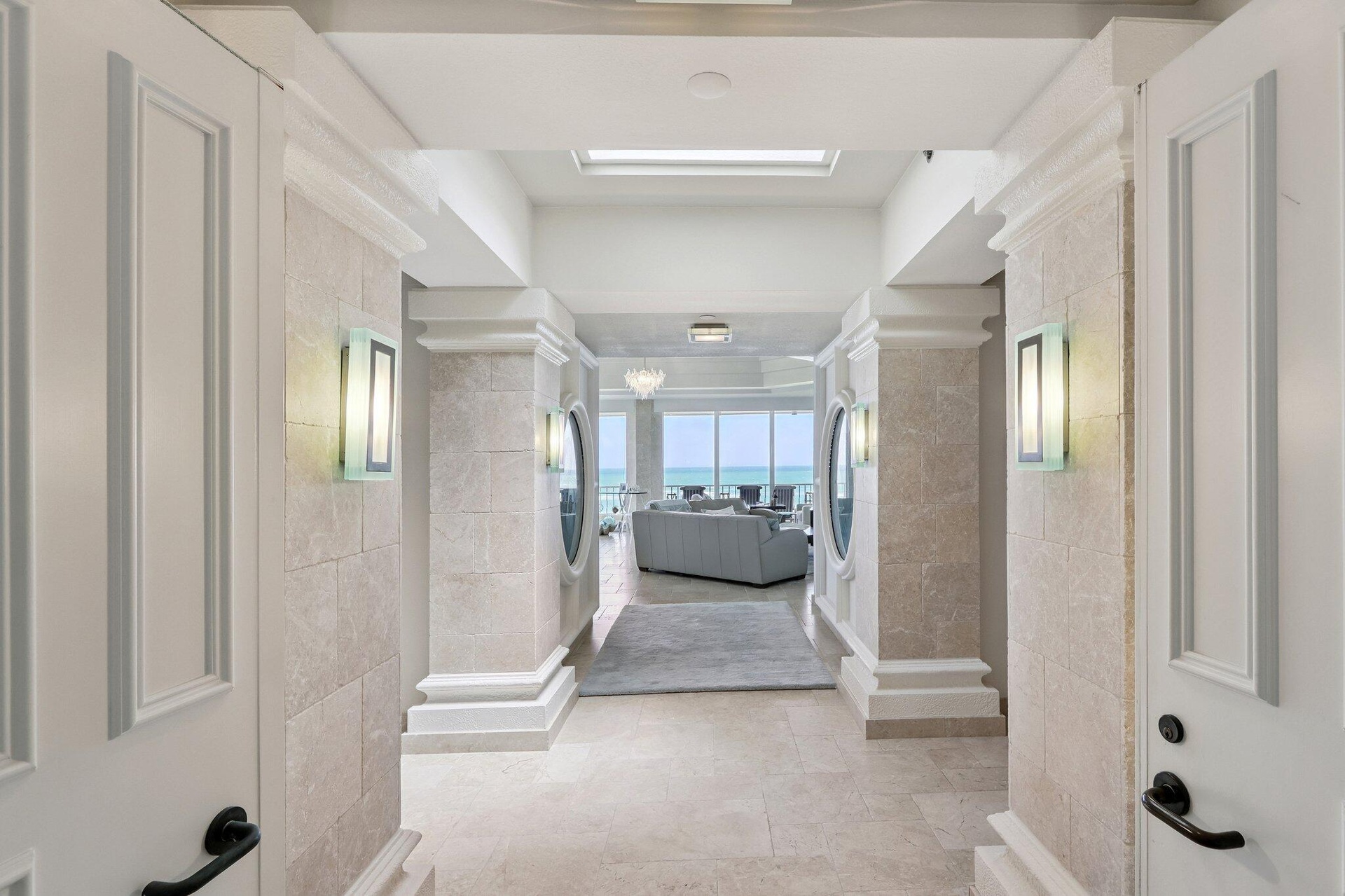 Experience elevated coastal living in this three bedroom, three and a half bathroom Sailfish Point PENTHOUSE with unobstructed Atlantic Ocean views. Arrive via elevator access shared by just two residences per floor, into a light-filled interior with volume ceilings, skylights, and open-concept living. Expansive impact glass windows create seamless indoor-outdoor flow, ideal for entertaining or quiet mornings by the sea. The layout includes a bedroom suited as a secondary owner's suite and a third bedroom with private balcony for sunset views. Architectural details such as travertine floors, etched glass, trim, and molding add character and timeless appeal. Two under-building parking spaces and air-conditioned storage included. Residents enjoy exclusive access to world-class amenities... including a Nicklaus 'Signature' golf course, beachfront clubhouse, multiple dining venues, full-service marina with ocean access, fitness and aquatics complex, spa, tennis, pickleball, and 24/7 security