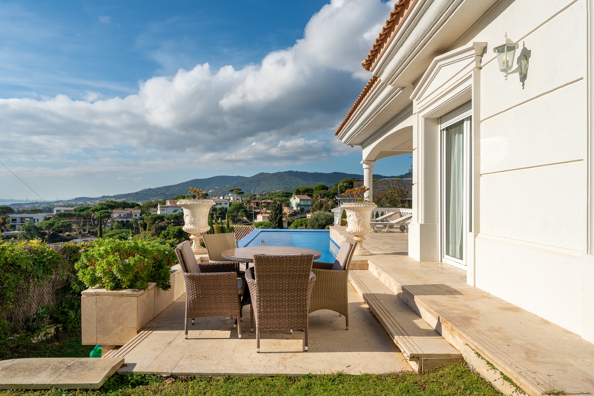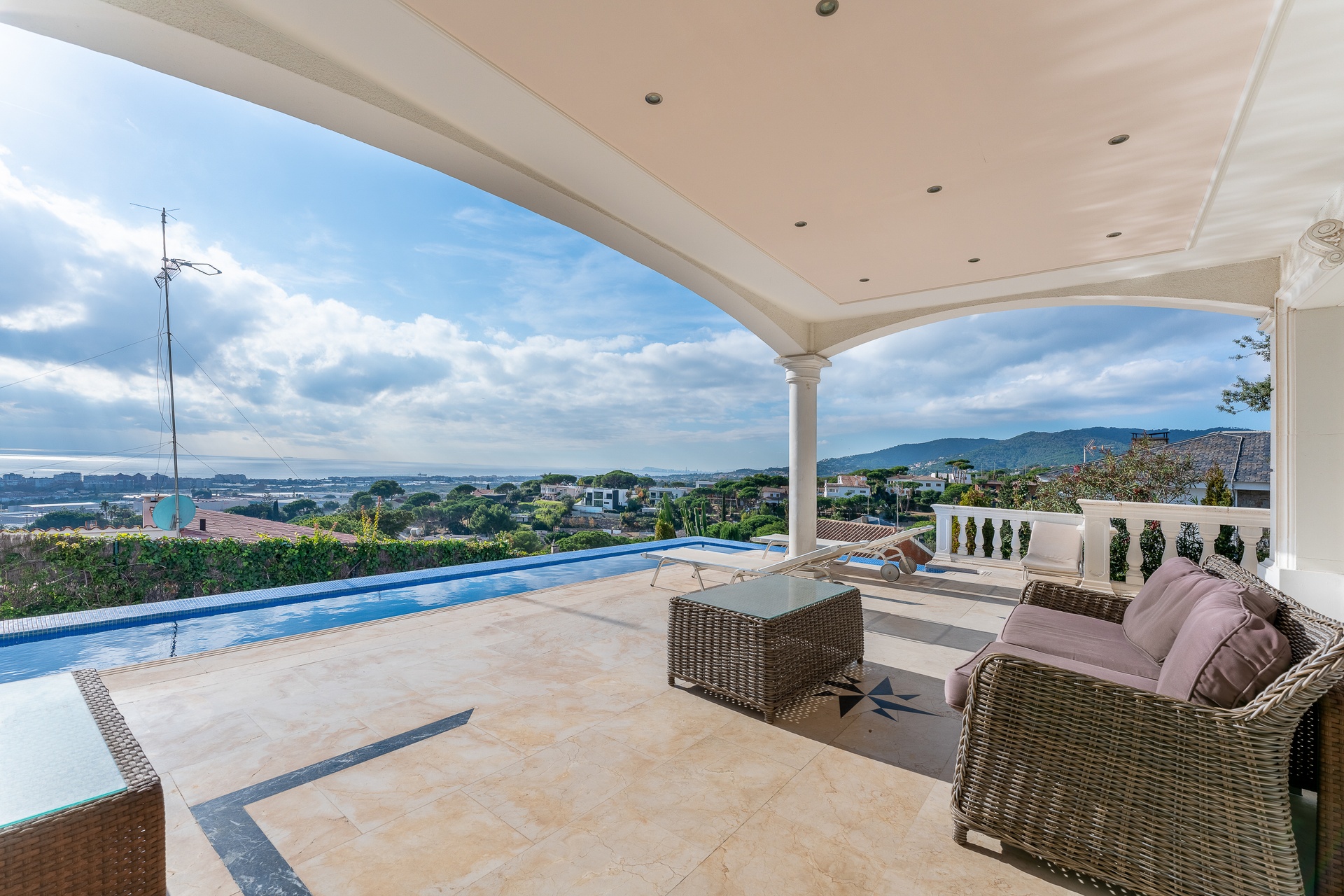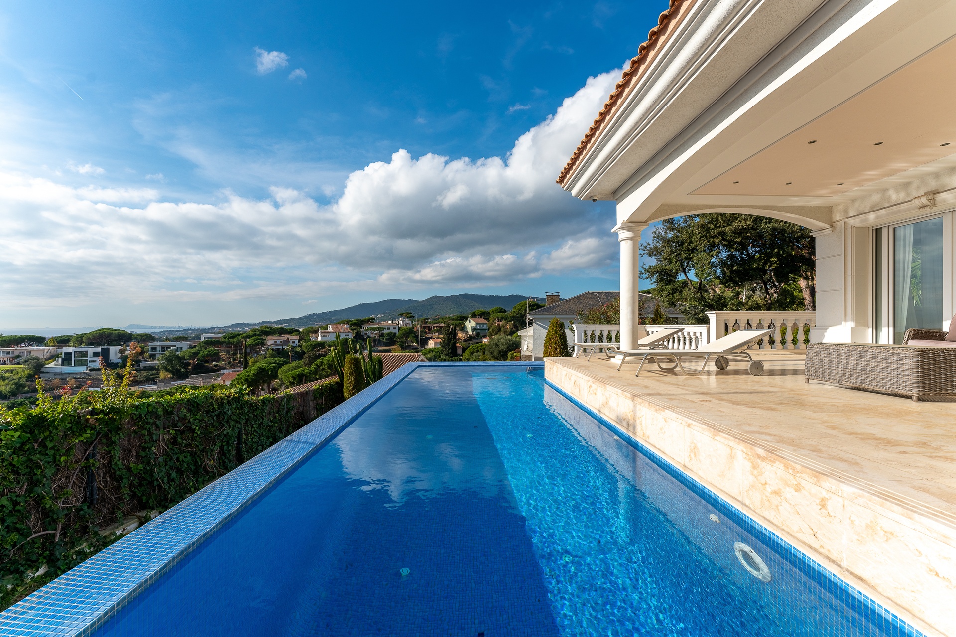 This exceptional villa features five refined bedroom suites and six bathrooms, thoughtfully designed to offer a living experience defined by space, balance, and sophistication. The interiors are bright and beautifully proportioned, showcasing noble materials such as marble flooring, classical columns, and expansive windows framing breathtaking panoramic views of the sea and the Barcelona skyline.
