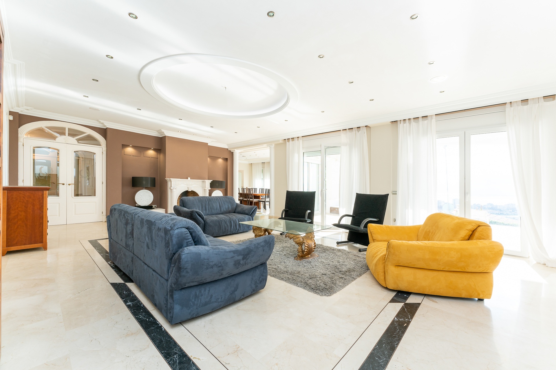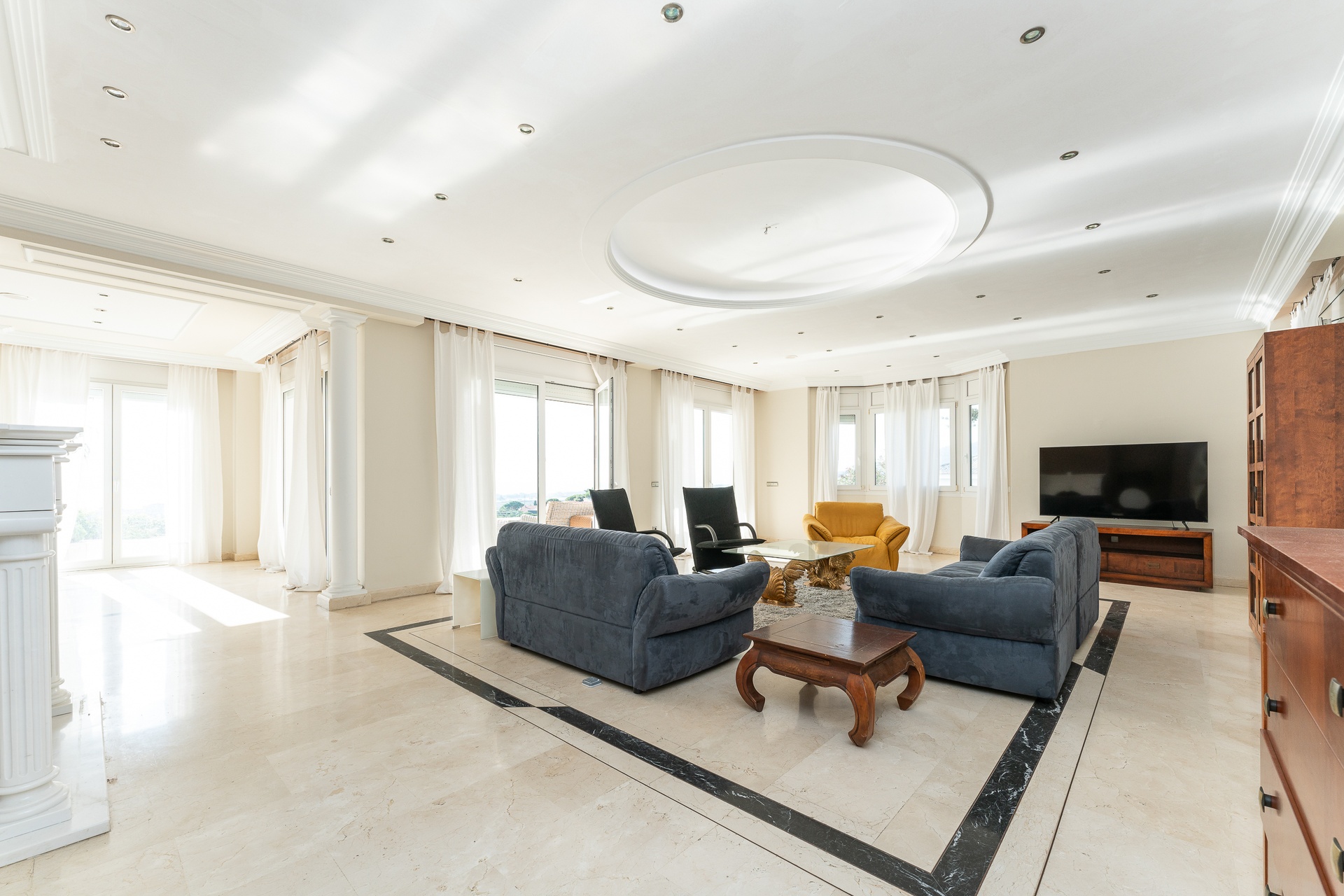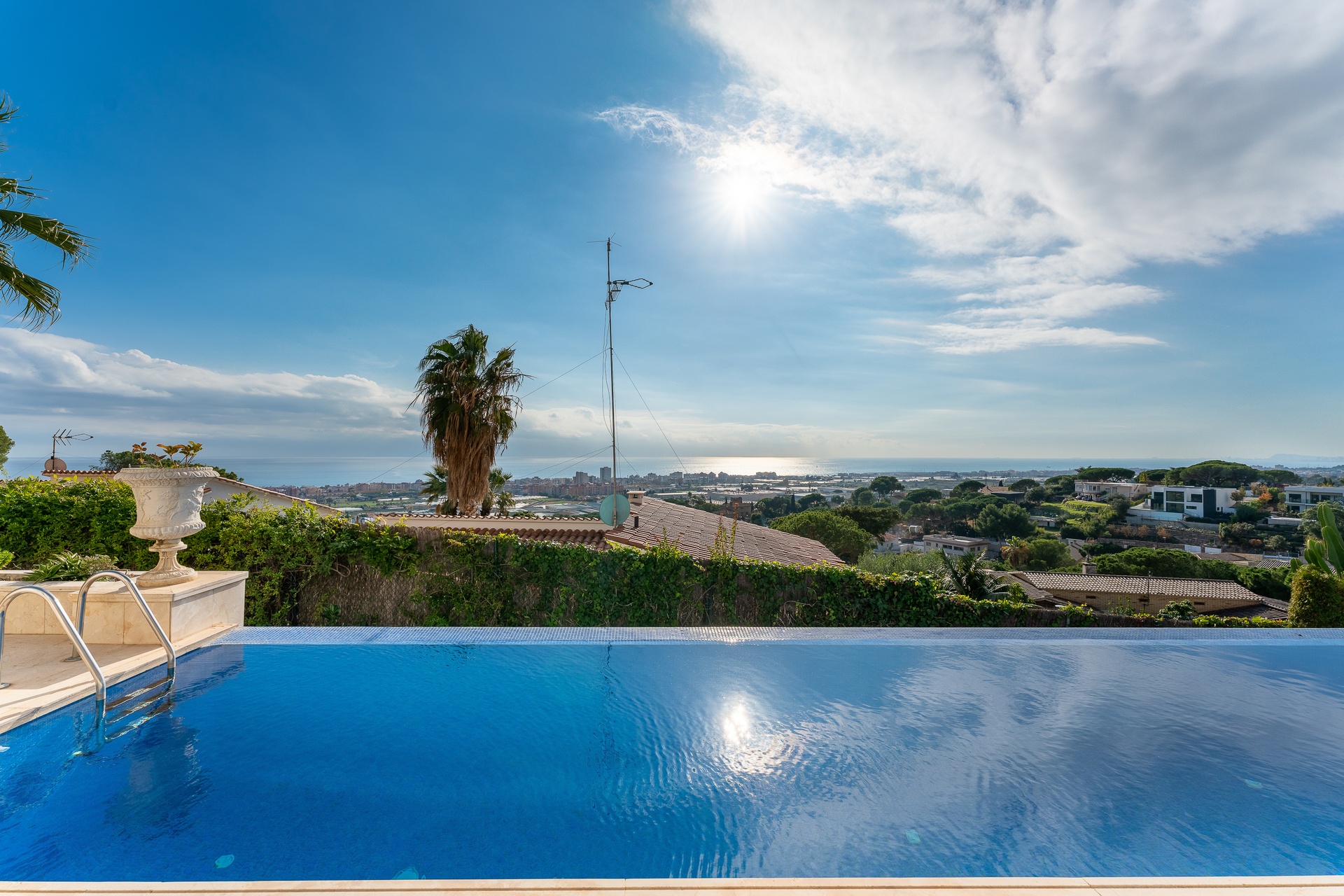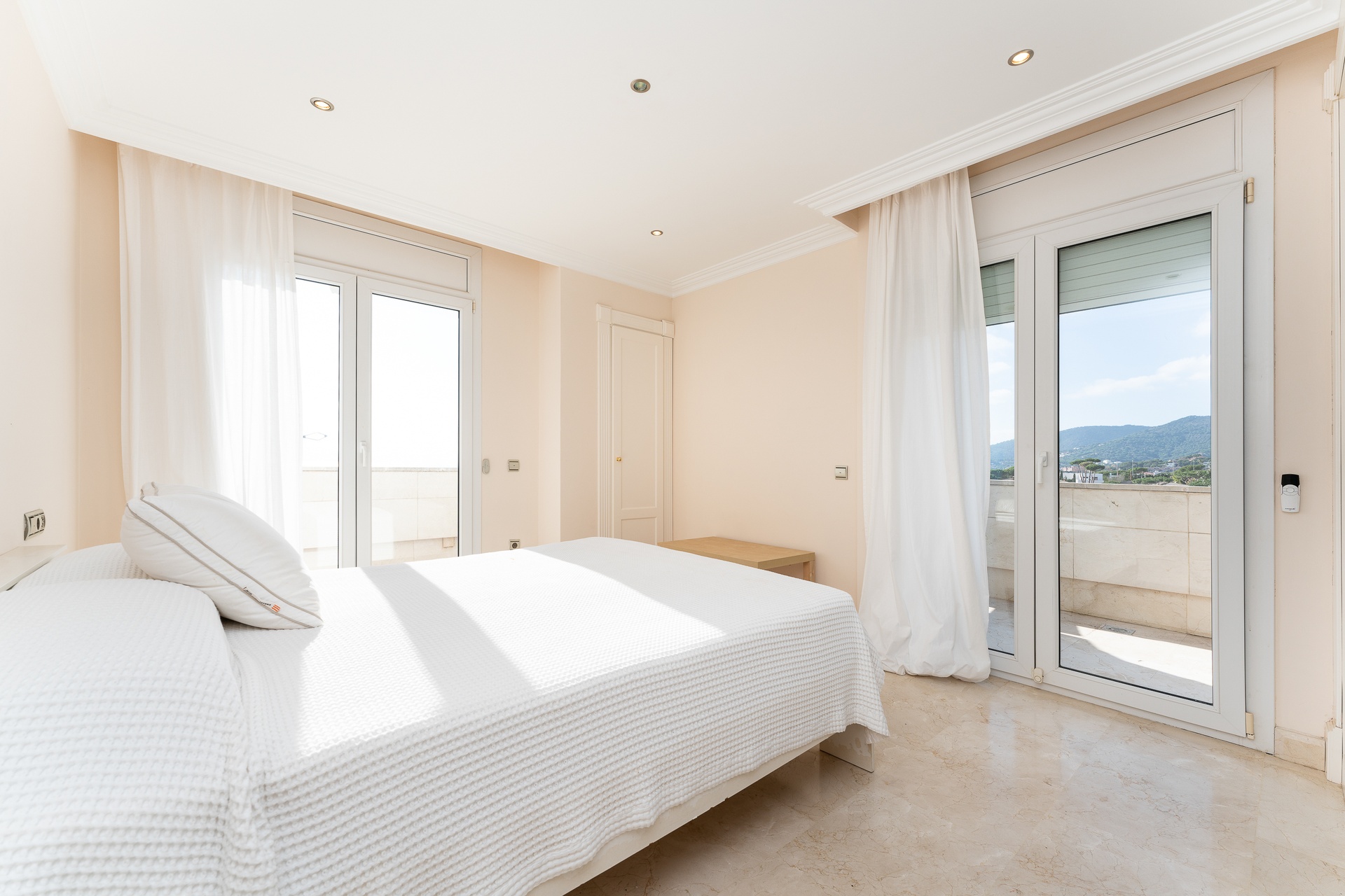 This exceptional villa features five refined bedroom suites and six bathrooms, thoughtfully designed to offer a living experience defined by space, balance, and sophistication. The interiors are bright and beautifully proportioned, showcasing noble materials such as marble flooring, classical columns, and expansive windows framing breathtaking panoramic views of the sea and the Barcelona skyline.