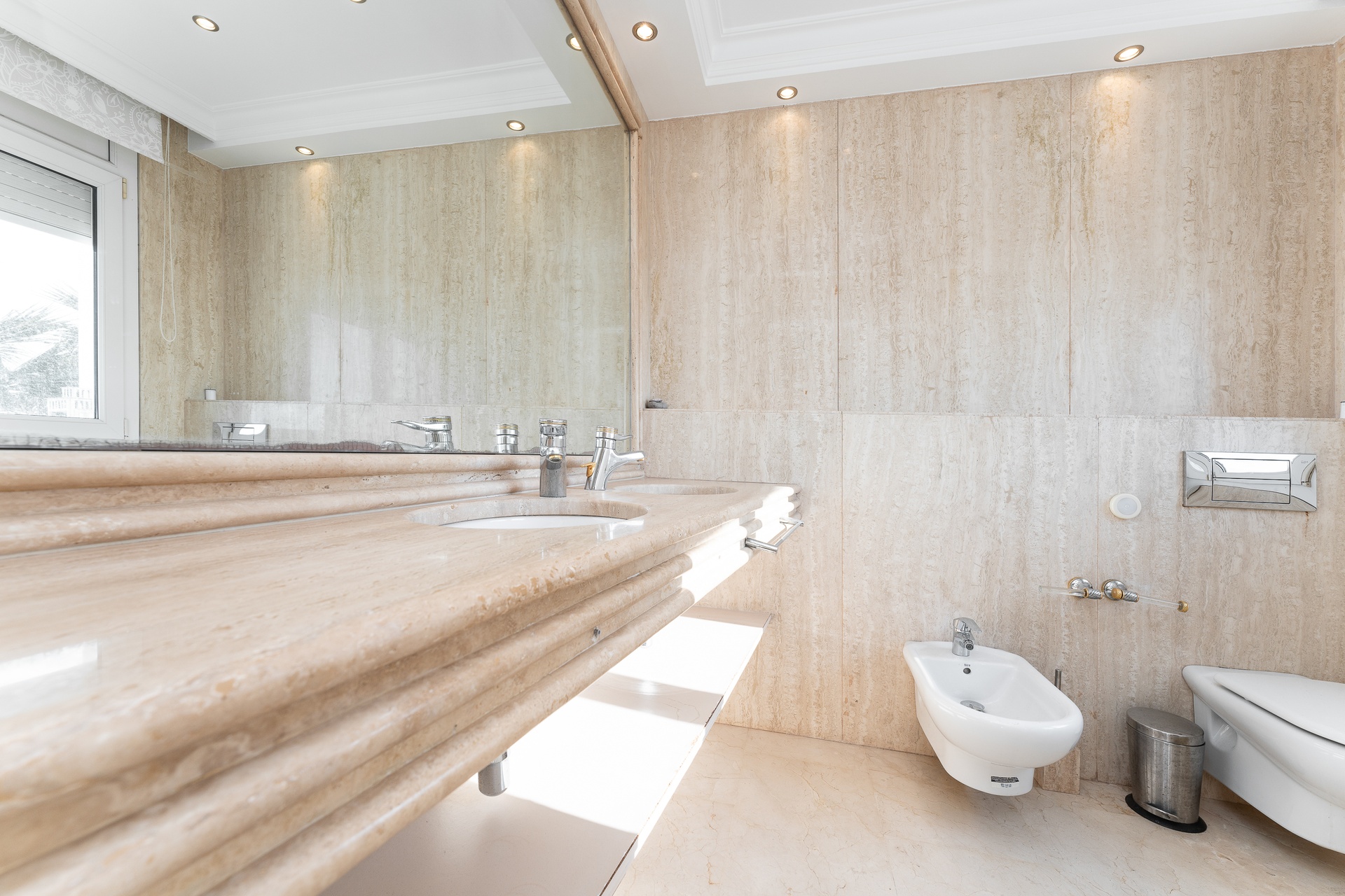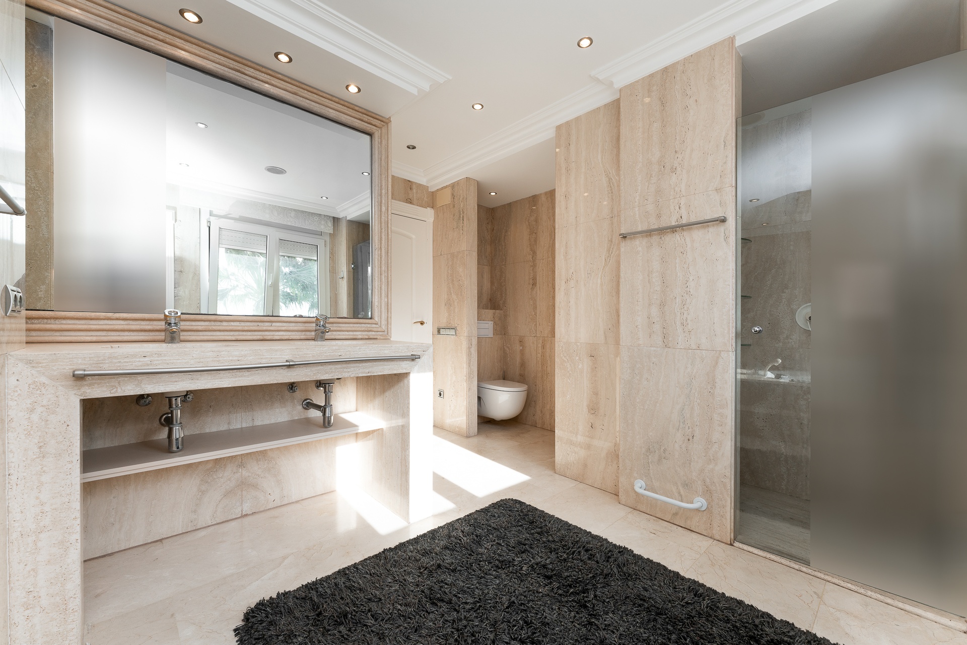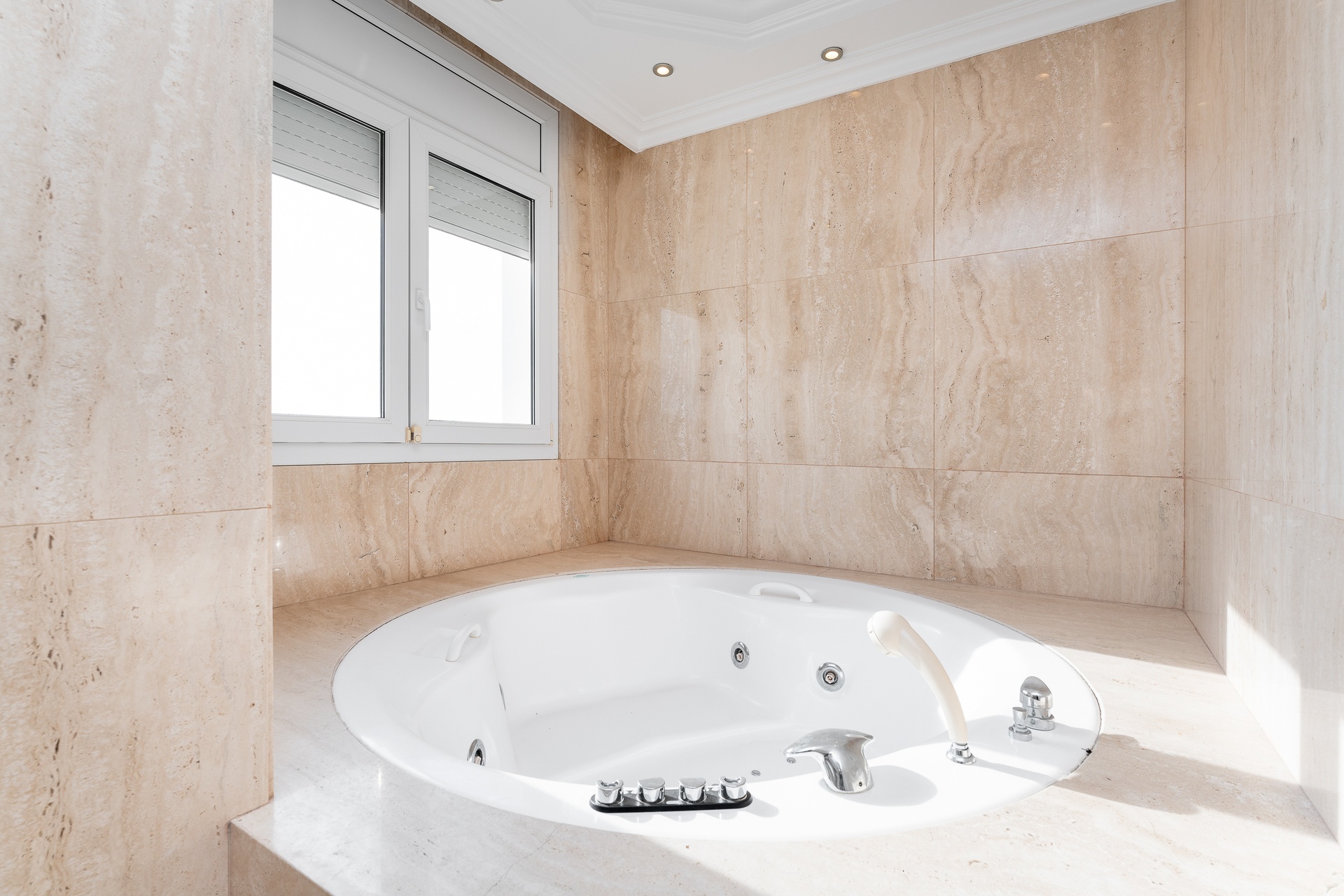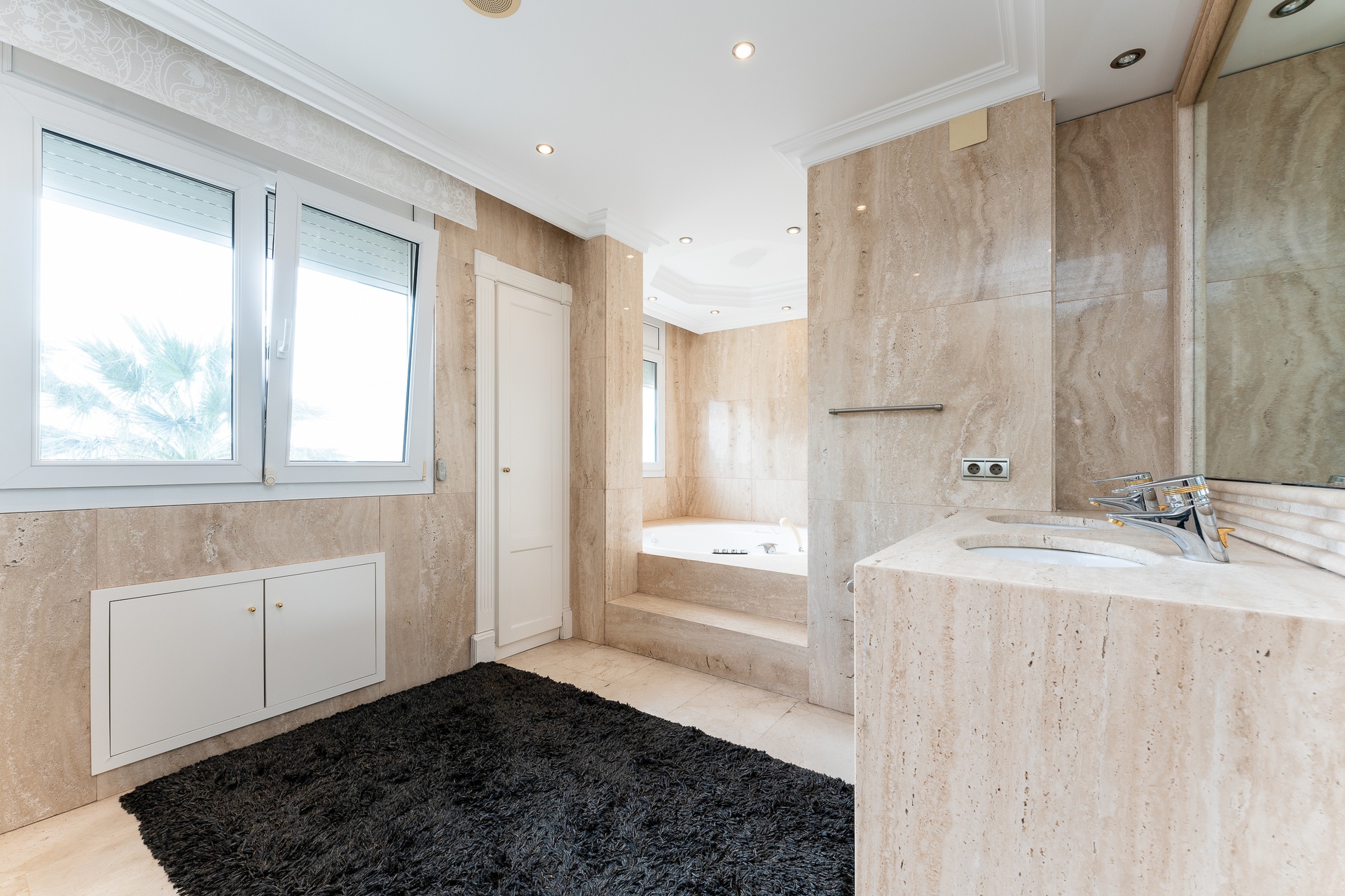 The property is further enhanced by a sophisticated bathroom featuring a hydromassage bathtub and natural stone finishes, designed as a private wellness retreat.