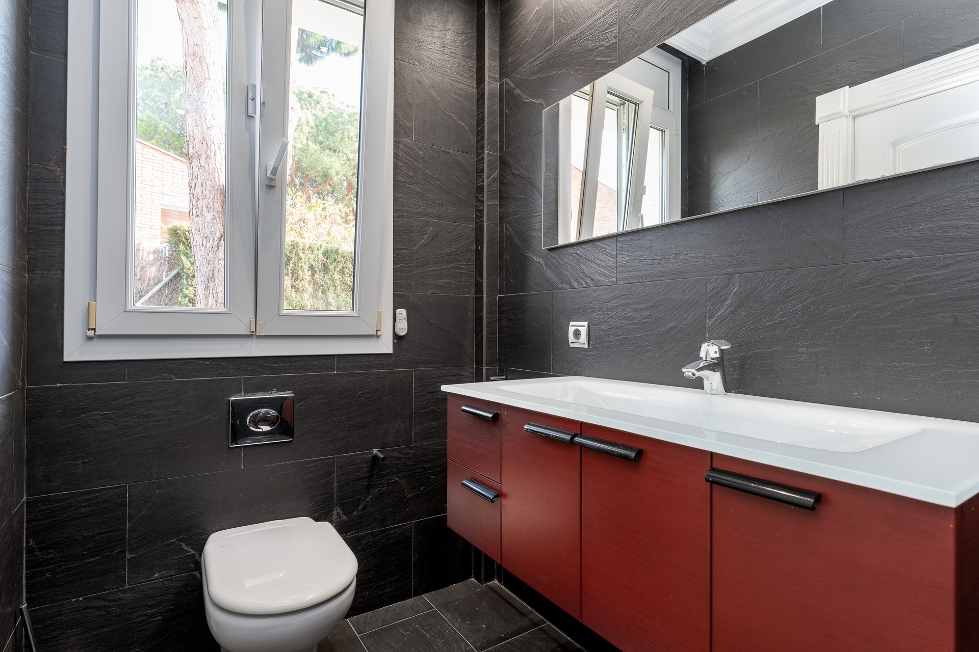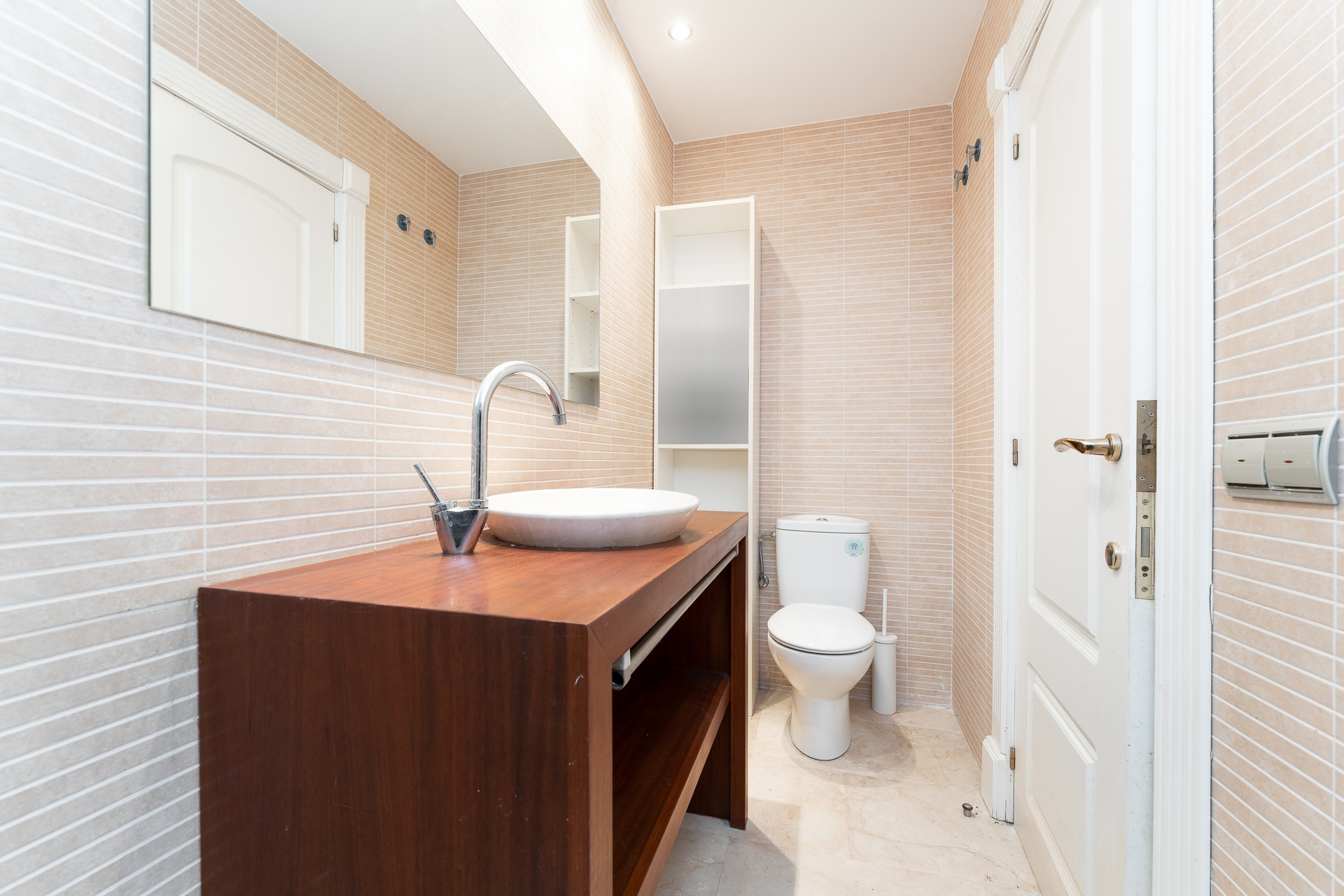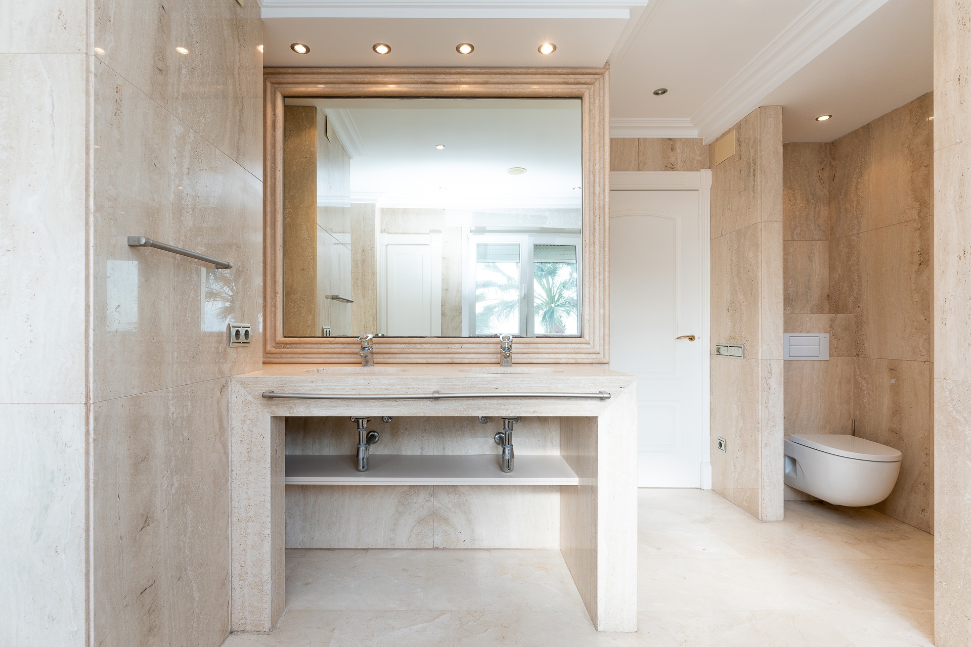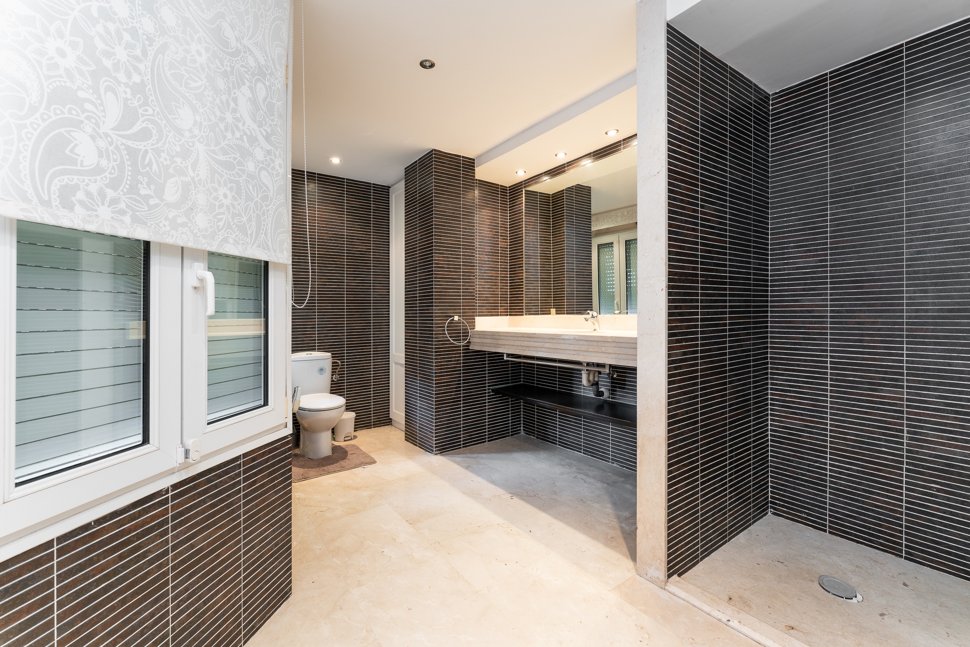 The property is further enhanced by a sophisticated bathroom featuring a hydromassage bathtub and natural stone finishes, designed as a private wellness retreat.