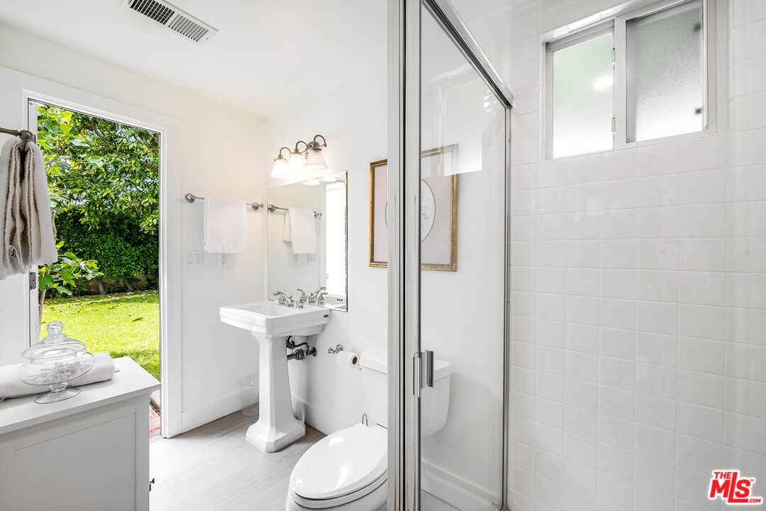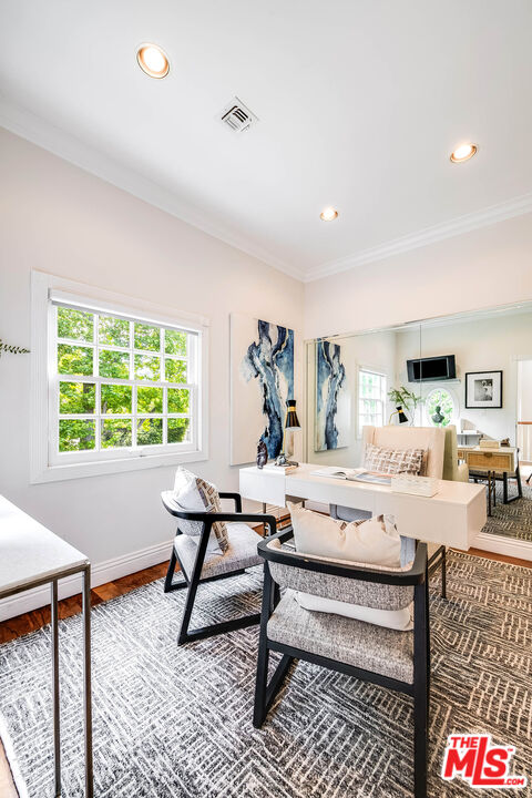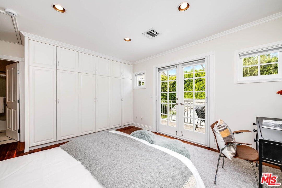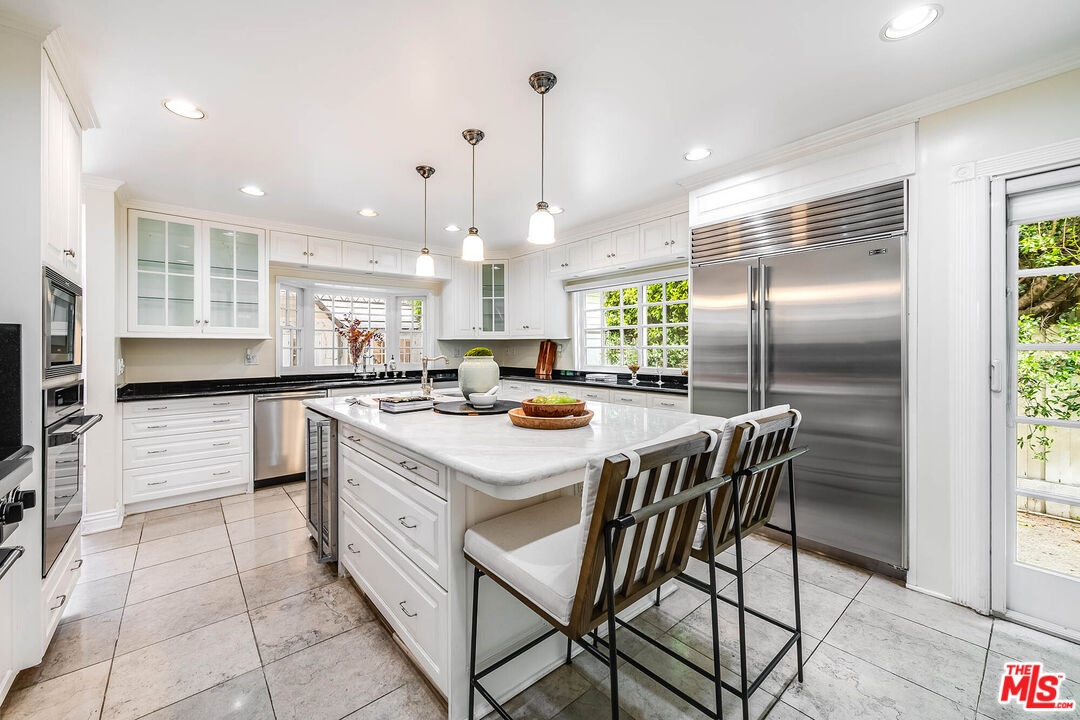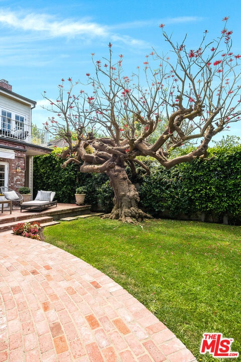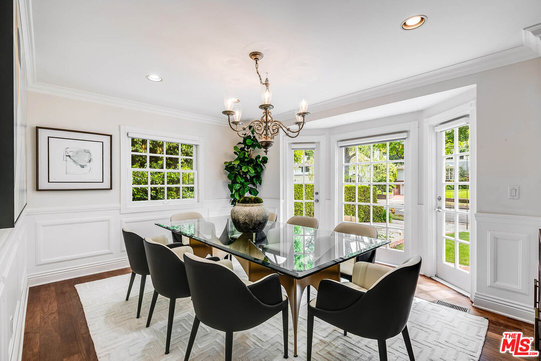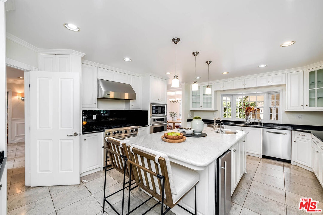 Spanning almost 4,800 square feet, including a fully permitted 558-square-foot ADU, this exceptional traditional residence offers a rare five-bedroom, six-bath compound on one of Holmby Westwood's most coveted streets. Beautifully positioned on a flat lot along prestigious, tree-lined Loring Avenue, the residence showcases refined detailing throughout, including crown moldings, hardwood floors, wainscoting, and French doors that open across the rear of the home to the expansive grounds. There are 4 second level bedrooms. The primary suite is a true retreat, featuring a sitting area with fireplace, French doors opening to a private balcony overlooking the garden, generous dual closets, and a luxurious step-down marble bath with vanity, soaking tub and separate shower. Three additional upstairs bedrooms each offer ensuite baths, providing comfort and privacy for family and guests. Designed for both elegant entertaining and relaxed daily living, the home features a grand formal living room with fireplace, formal dining room with bay windows, a sophisticated den or office with wet bar, and an inviting family room that flows effortlessly into the breakfast area and gourmet kitchen. The kitchen is appointed with marble countertops, high-end stainless appliances, a large pantry, and an oversized center island.The private backyard evokes the quintessential California lifestyle, with mature landscaping, brick patio, grassy lawn, spa, and an extraordinary 525-square-foot covered outdoor living area ideal for year-round entertaining, alfresco dining, and game-day gatherings. The detached ADU includes a sitting area, bedroom, and full bath, offering exceptional flexibility for guests, extended family, or a private workspace.Ideally located moments from Warner Avenue Elementary, Holmby Park, Century City, Beverly Hills, UCLA, and Westwood Village, this move-in-ready residence represents a rare opportunity to own an updated classic in one of the neighborhood's most prestigious settings.