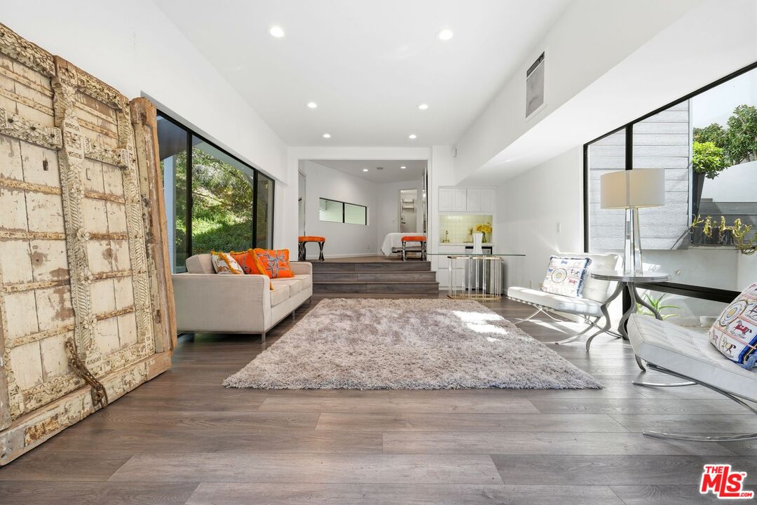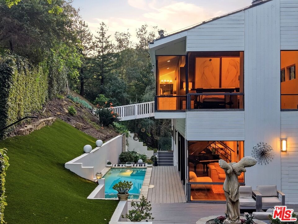 Secluded in the tranquil hills of Benedict Canyon, this private, gated retreat offers a rare sense of escape surrounded by towering trees and lush natural landscape. Tucked at the end of an approximately 200-foot private driveway, the home feels worlds away while still providing convenient access to the city. Inside, the residence is filled with warmth and natural light. Wide-plank flooring flows throughout the living spaces, while expansive picture windows and glass doors frame peaceful views of the surrounding greenery from nearly every room. The remodeled kitchen is thoughtfully designed with a striking center island, eye-catching backsplash, stainless-steel appliances, bright white cabinetry, and stylish modern finishes. Just off the kitchen, a charming greenhouse-style breakfast nook creates a light-filled setting for casual meals. The formal living room centers around a decorative fireplace and captures sweeping views of the hillside and landscaped grounds. The primary suite offers a calming sanctuary with a spacious walk-in closet and a well-appointed bathroom featuring a dual-sink vanity, separate shower, and jetted soaking tub. Additional bedrooms provide a cozy, elevated feel reminiscent of a treetop retreat. A separate remodeled guest house enhances the property with its own kitchenette, bathroom, and private patio-perfect for visitors, extended stays, or a flexible workspace. The outdoor setting is designed for both relaxation and entertaining, with grassy areas, rolling terrain, winding cobblestone pathways, water features, lounging decks, a built-in barbecue, and a sparkling pool and spa. Multiple outdoor seating and dining areas invite effortless al fresco living surrounded by nature. Situated within the highly desirable attendance boundaries for Warner Avenue Elementary School, this Benedict Canyon retreat blends privacy, charm, and a true connection to its natural surroundings.