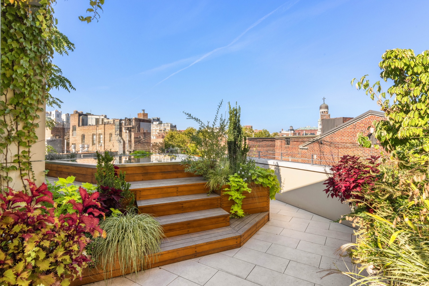 The townhouse is crowned with the ROOFTOP GARDEN elevated by a soaking pool, an outdoor kitchen outfitted with Viking appliances, built-in Cedar benches and an automated audio and lighting system.