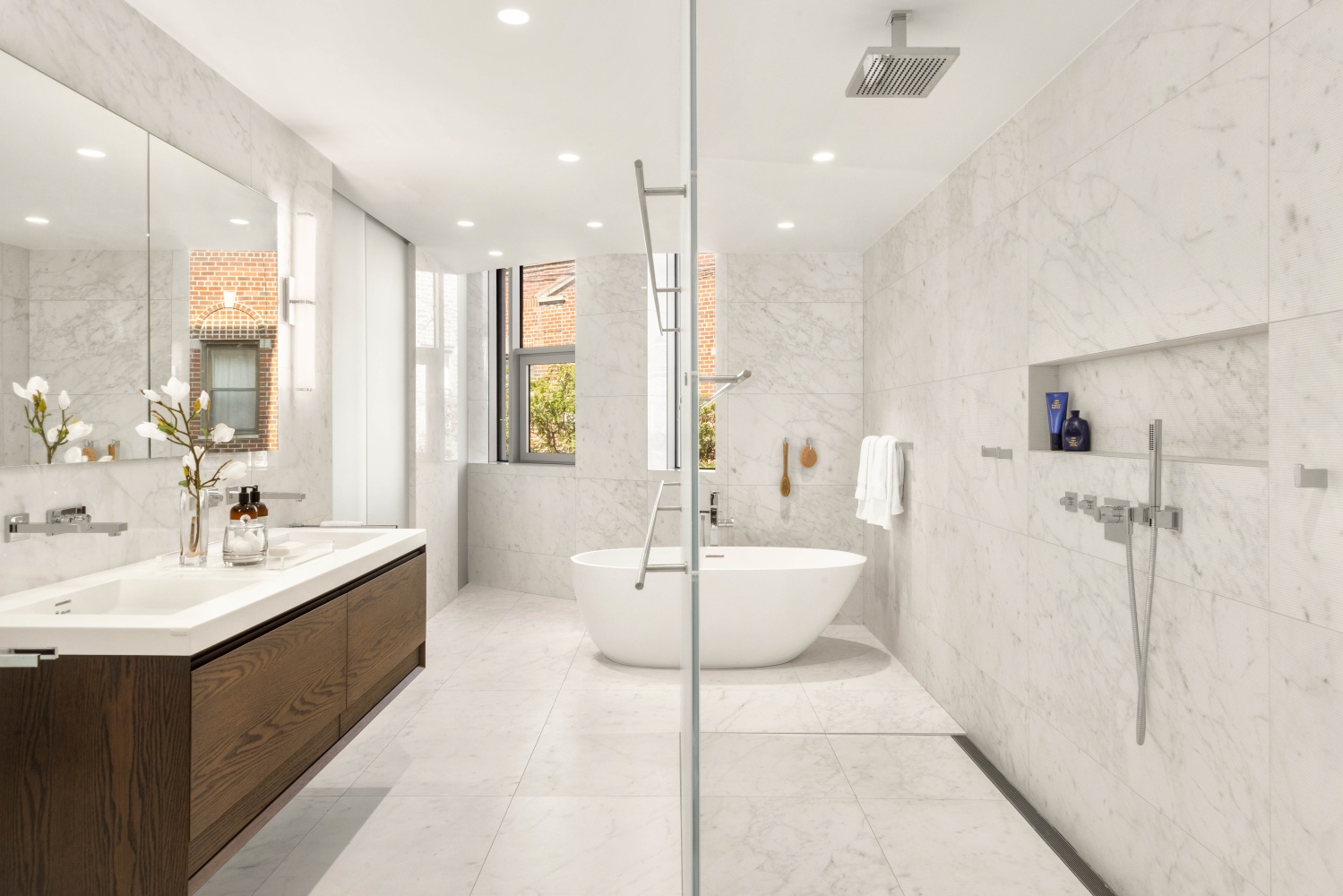 The 55-foot-long primary suite occupies the entire FIFTH FLOOR, complete with a king-size sleeping chamber, a windowed dressing room with bespoke built-in closets, and a sumptuous windowed bathroom adorned with Dorn-Bracht fixtures, a Wetstyle freestanding tub, a floating double vanity, and a walk-through multi-head shower.