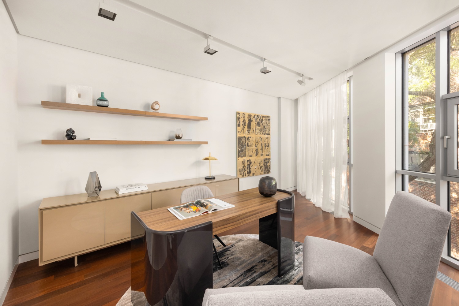 The home begins at the GALLERY LEVEL, complete with an elevator landing that overlooks the garden level, indoor access to your private car garage and an entrance wardrobe. Stepping down to the GARDEN LEVEL you are welcomed by a double-height entertainment room with a sleek gas fireplace and floor to ceiling windows that seamlessly unite an indoor and outdoor living experience. Your serene garden is nestled within lush bamboo plantings and a water wall feature.