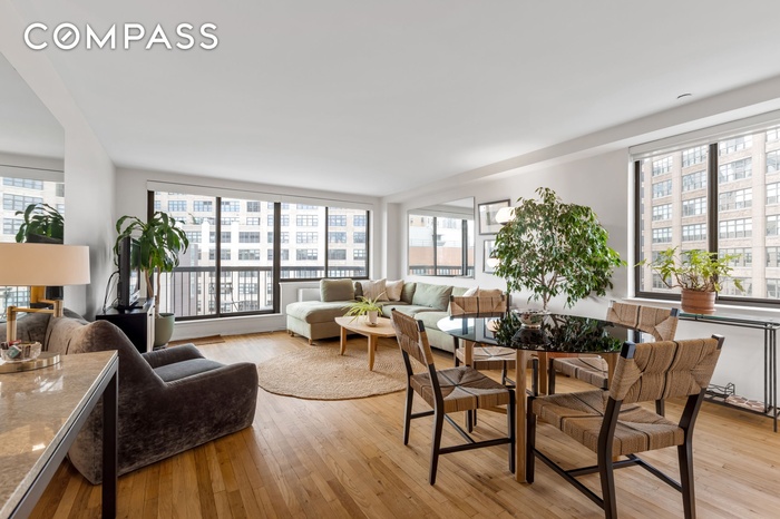 This beautifully proportioned home offers two generous bedrooms and two full bathrooms, thoughtfully designed for comfortable daily living as well as entertaining. With sunny southern and western exposures, the apartment is filled with natural light throughout the day, while oversized windows with motorized shades frame open views, including a glimpse of the downtown skyline. Just off the living space, a private 75-square-foot balcony offers the perfect spot for morning coffee or an evening unwind above the city.