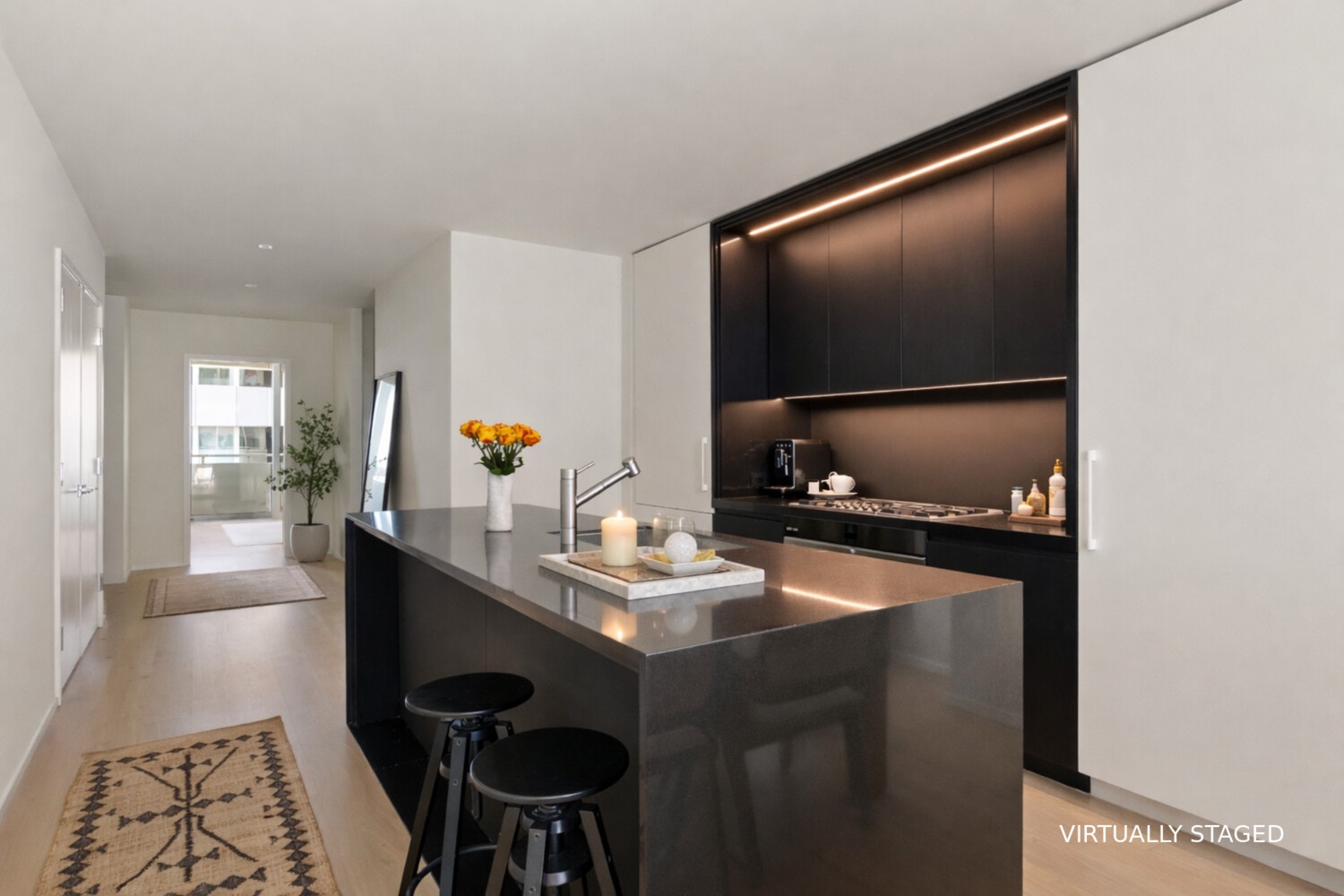 The bespoke kitchen is a study in modern refinement, appointed with Gaggenau appliances, polished quartz countertops, and striking acid-etched black glass cabinetry with custom millwork interiors-perfectly suited for both everyday living and elegant entertaining.